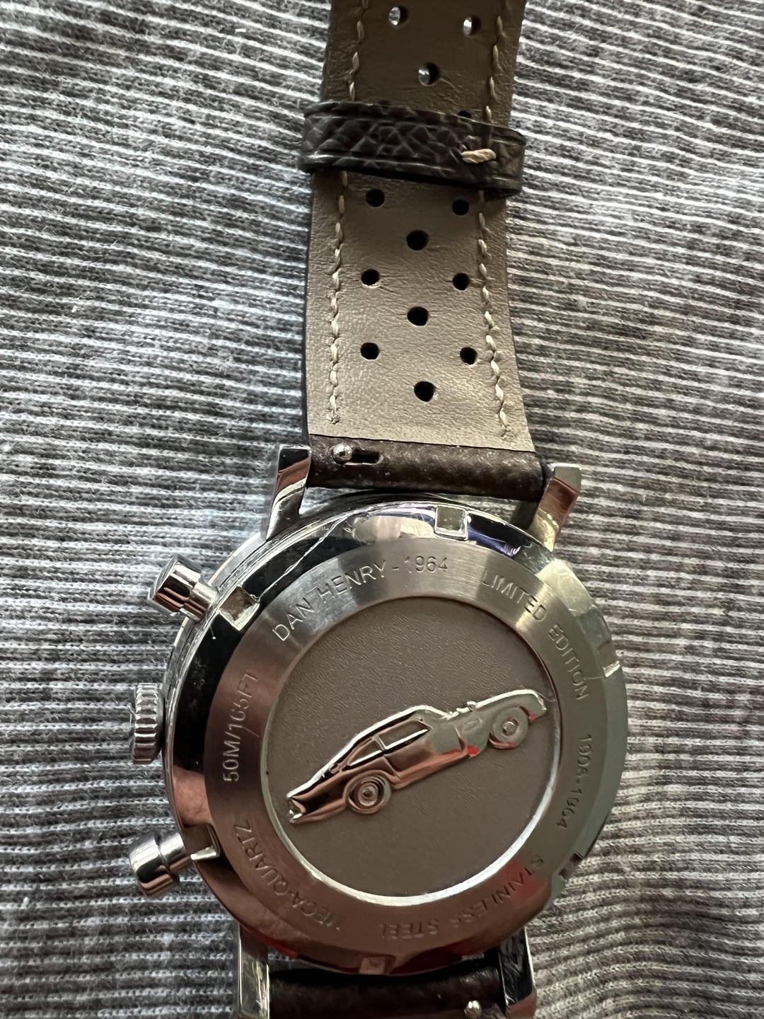 Hello! Today selling my Dan Henry 1964 chronograph! Amazing watch, just looking to sell my collection to save up for something bigger. Specs: [https://danhenrywatches.com/products/1964-gran-turismo-chronograph?utm\_source=google&utm\_medium=cpc&utm\_campaign=PmaxUS&gad\_source=1&gclid=CjwKCAiAxea5BhBeEiwAh4t5K7hbd4B8K5eqXpzQKrgIgWTTlsizy1XzoJztdqYRwMyfOy5vuS-uNhoCccUQAvD\_BwE](https://danhenrywatches.com/products/1964-gran-turismo-chronograph?utm_source=google&utm_medium=cpc&utm_campaign=PmaxUS&gad_source=1&gclid=CjwKCAiAxea5BhBeEiwAh4t5K7hbd4B8K5eqXpzQKrgIgWTTlsizy1XzoJztdqYRwMyfOy5vuS-uNhoCccUQAvD_BwE) Silver Dial Tricompax with Date Solid scratch on the caseback (picture shown). Crystal is perfect and free of any scratches or blemishes. Battery replaced summer 2024. Included original leather strap and bracelet +1 additional leather strap from Dan Henry **Asking $200 including shipping.** **UPS Ground CONUS only\*** **PM ONLY** **Venmo, Zelle, Paypal** Thanks!