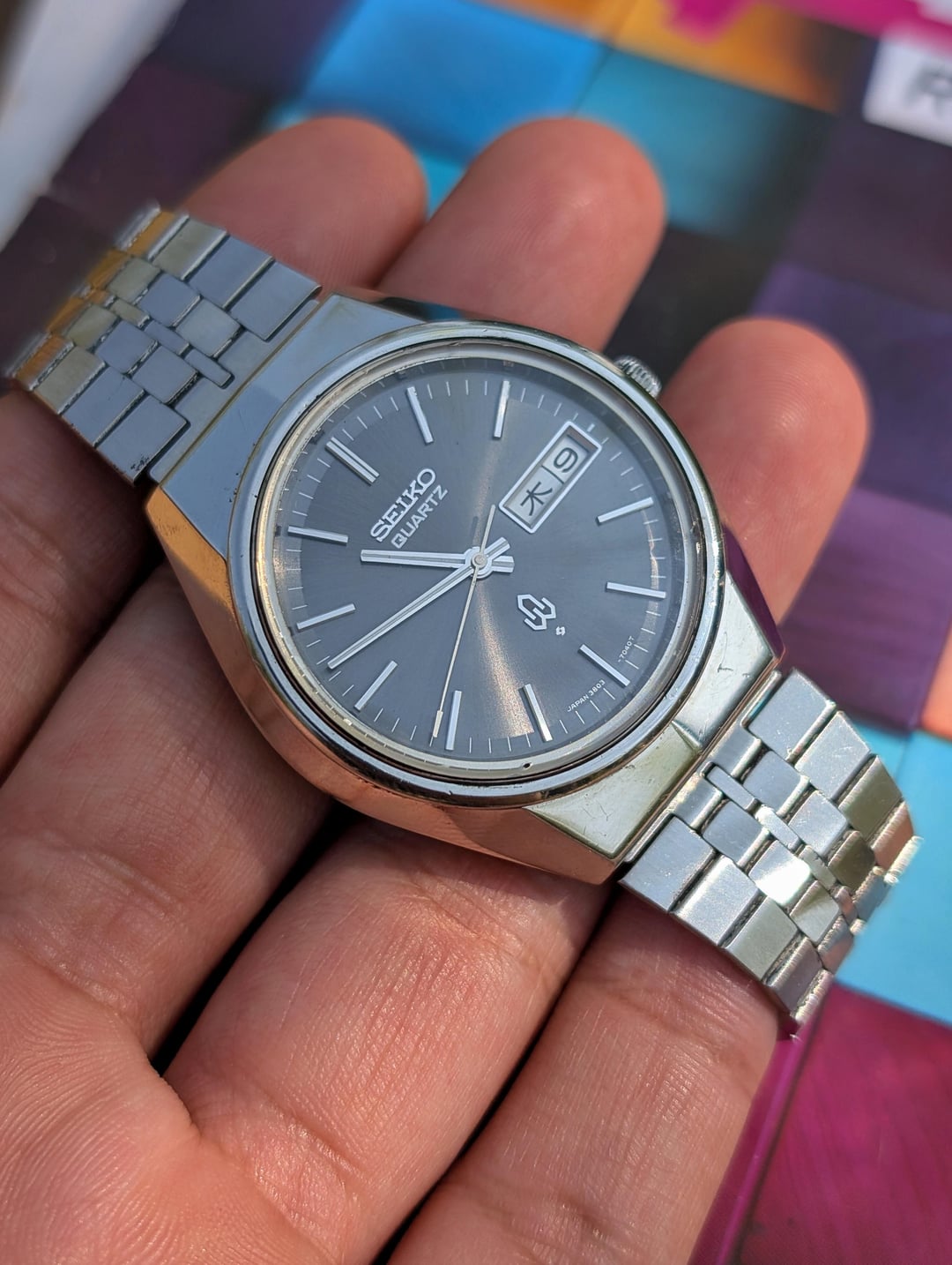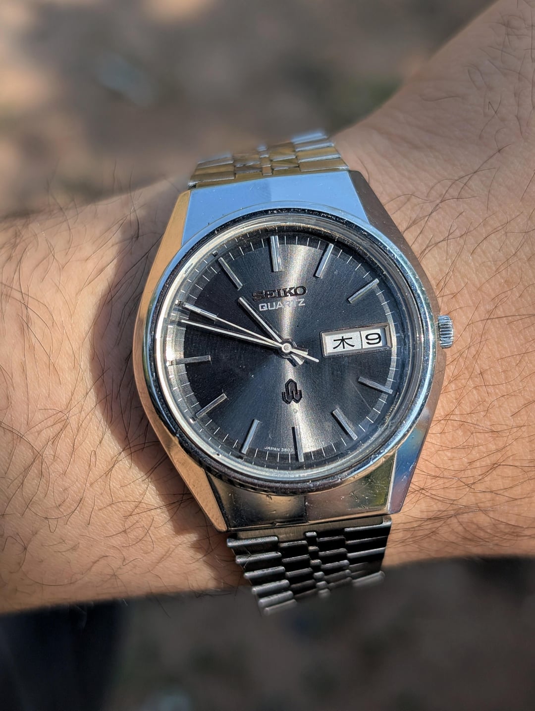Greetings Watchexchange! Up for sale is a beautiful early quartz Seiko 3803-7020 with a lovely dark grey sunburst dial. The watch measures 37mm in diameter. The Seiko 38 is one of the earliest production quartz movements, and as a result is rather thick. The watch comes on an aftermarket Japanese Maruman bracelet. The watch has a lovely mineral crystal in good condition as pictured. The watch is pictured on a 6.5" wrist for size reference. The watch features an English/Kanji bilingual date wheel [Timestamp ](https://imgur.com/a/GlSJT4D). The watch is priced to sell at $179 paid via Zelle or Wise and shipped via UPS. Please allow 3 to 5 business days of your payment for the watch to be shipped out. Be sure to reach out to me if you have any questions or require additional photographs or information, I entertain requests for custom timestamps. Thanks for looking!