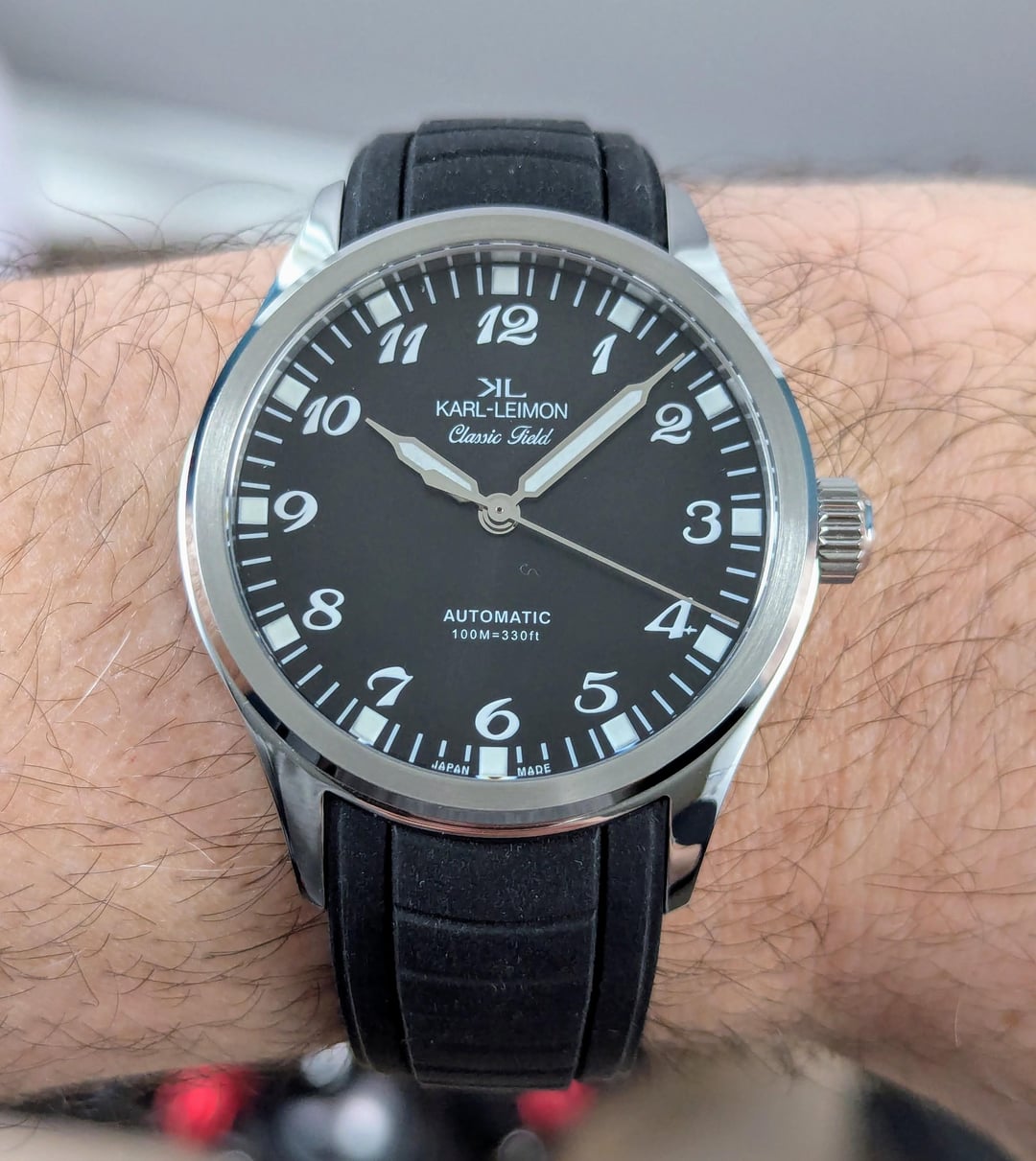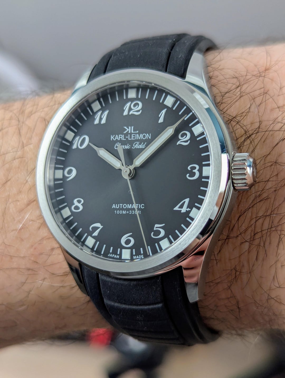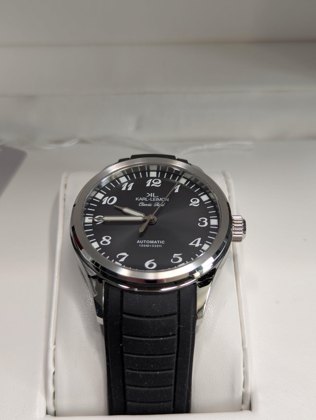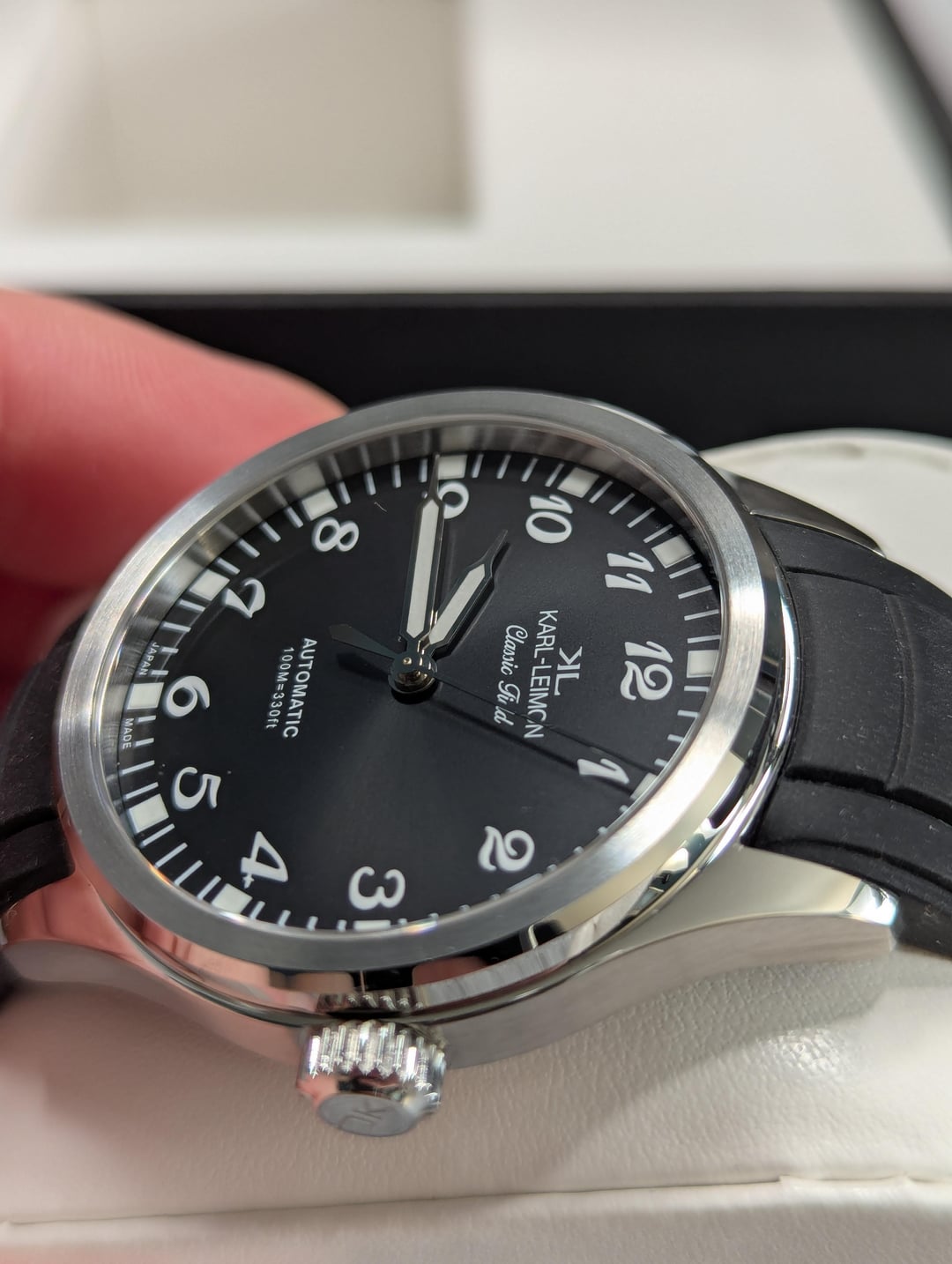 Up for sale is my Karl Leimon Classic field watch Black sun ray dial printed arabics. CONDITION IS MINT NEW **Case Material:** 316L Stainless Steel **Case Finish:** Polished, satin-brushed **Glass:** Anti-reflective sapphire glass **Case Diameter:** 38mm **Case Thickness:** 9.5mm **lug to lug:** 46mm **lug width:** 20mm **Water Resistance:** 10ATM **Screw down crown** **Movement:** Miyota 9039, 3Hands Automatic and Hand winding, 42Hour Power Reserve Price: $220 USD PPGS +4% Shipped