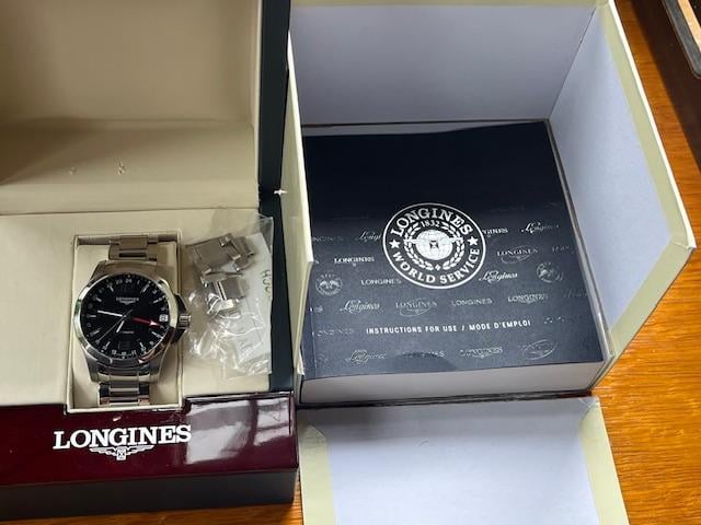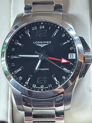 Selling my Longines Conquest GMT, in very good condition. Other than some light rashes on the side of the case, the crystal is clean and the bracelet is in great condition. Some information: \- Swiss Made \- Black Dial \- Arabic Numeral 12, 6 & Index Hour Markers \- 24 Hour Display Around Dial \- Red GMT Second Time Zone Hand \- Second / Minute Track Around Outer Rim of Dial \- Polished Stainless Steel Bezel \- Date Feature \- GMT Second Time Zone Feature \- 46 Hour Power Reserve \- Self-winding Automatic Movement \- Longines Caliber L704.2 \- Vibrations Per Hour: 28,800 \- Jewels: 24 \- Manufacturer Box & Manual \- Brushed with Polished Stainless Steel Case \- Brushed with Polished Stainless Steel Bracelet \- Scratch Resistant Sapphire Crystal with Anti-reflective Coating \- 50 Meters / 165 Feet Water-Resistant \- 41mm = 1 5/8" Case, 7" Adjustable Bracelet \- Case Thickness: 14mm \- Lug width: 20mm \- Fixed Bezel \- Solid Case Back \- Luminescent Hands & Hour Markers \- Push & Pull Crown \- Screw Down Caseback I’m asking for $750, which will include shipping to CONUS. Outside of CONUS, we can discuss splitting shipping cost. I will take PayPal F&F, Venmo, or Zelle. Please add 4.5 % if using PayPal G&S. Let me know if you have questions or want additional pics. Please comment on this thread before messaging me.