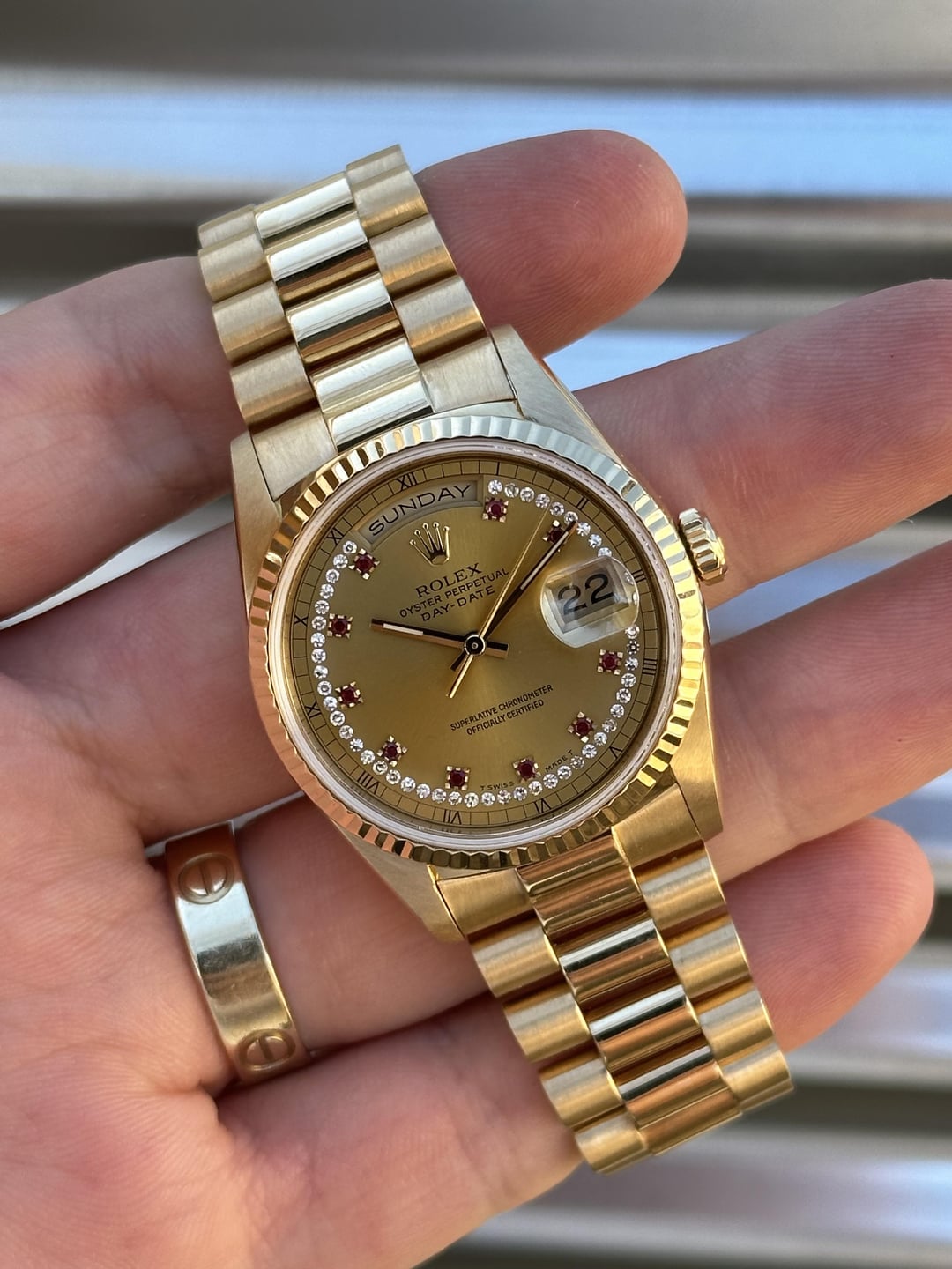 Check out this stunning Rolex Day-Date 36mm, in solid 18k gold, with a rare ruby-string dial. Not only is it in beautiful condition, but it also comes with box and papers as well. Double-quickset. Reference number: 18238 Serial number: N***** which dates this watch to 1991 Comes with Box & Papers (please see second picture for everything that’s included) 💰1️⃣9️⃣,5️⃣0️⃣0️⃣+✈️ The watch is overall very clean and in great pre-owned condition and ready for a new owner. Take a look at the condition in the pictures. Case is super nice with thick thick lugs and sharp edges. Dial and hands are clean with no corrosion. Bezel is in good shape. Very clean finish on the bracelet. The coronet is thick and well defined. 5 screws on the bracelet so it fits about a 7.25” wrist. Free of any major dings or dents. Overall this piece is a real head turner and is ready to be enjoyed by a new owner. This would make a great addition for any true collector, and with gold rallying recently, having a solid gold piece is a no brainer. 💰1️⃣9️⃣,5️⃣0️⃣0️⃣+✈️ We accept Zelle/Wire. Shipped with fully insured overnight once payment clears, NO EXCEPTIONS. We have plenty of references across Facebook groups as well as Reddit feedback. Follow me on IG for more deals: @215watches All of our pictures are taken in natural light and are in no way edited through filters or computer programs in order to give the most accurate representation of the watch. Thank you for your time!! [photo album](https://imgur.com/a/zZ1U8b2) [time stamp](https://imgur.com/a/6Zwji6z)