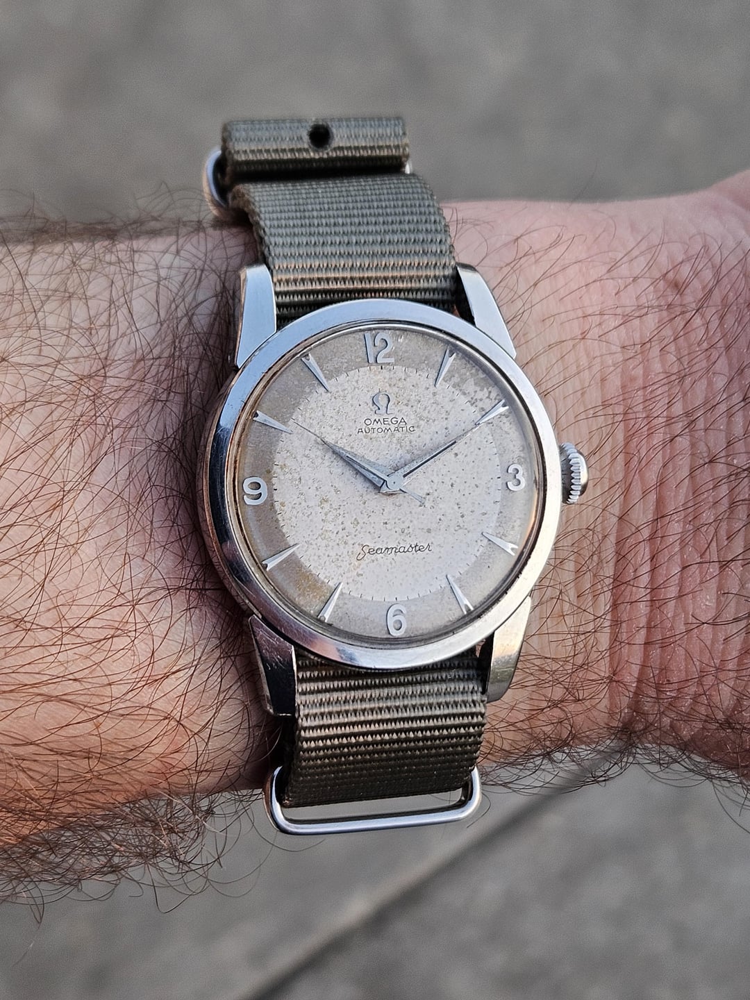 Hey there! For sale is an Omega Seamaster ‘Beefy Lugs’, reference 2846 7 SC. The watch dates to 1956. The watch is in good condition. Almost all of these develop their own unique patina on the dial and case, and this one is no exception. The watch is keeping time well for its age, and all functions of the watch are working as intended. It will include a black Hirsch and a Crown and Buckle olive nato. Album: [https://imgur.com/a/KE0ABP2](https://imgur.com/a/KE0ABP2) Timestamp: [https://imgur.com/a/xwdriQR](https://imgur.com/a/xwdriQR) Priced firm at $430, which will include insured CONUS shipping. PayPal or Zelle. No trades. Thanks for looking!