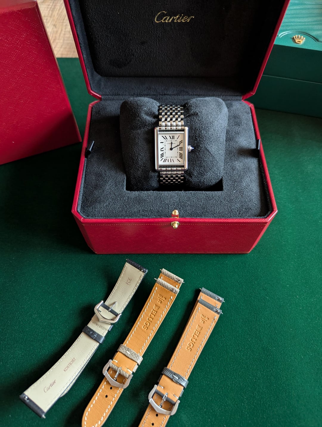 Hello! Up for sale is my Cartier Tank Must Large. Full set including box and papers. Dated 12/2022. Comes with Forstner 9-link bracelet, 2 delugs straps, and the original Cartier strap. Priced at $2950 shipped!!