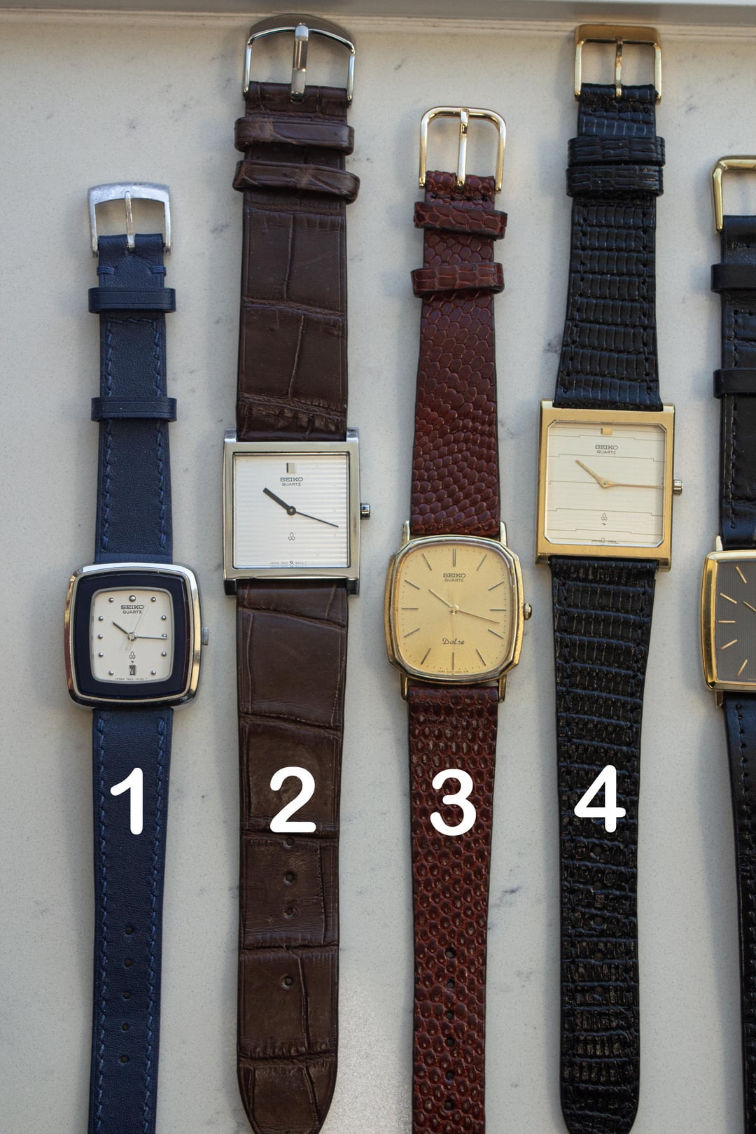 Happy Sunday, Here's a small collection of vintage tank watches I'm offering for sale this weekend. All pieces are in excellent condition, come with fresh batteries, and are keeping accurate time. You can see all the watches on my 6.75’’ wrist, the watches will come in a felt bag for extra protection. Below are more details on each watch, numbered from 1 to 8 from left to right: 1 – 1988 Seiko Quartz 7902-5060 – $80 2 – 1988 Seiko Quartz 7820-5350 – $100 3 – 1982 Seiko Dolce 6030-5550 – $90 4 – 1988 Seiko Quartz 2820-5220 – $110 5 – 1989 Seiko Quartz 2620-5370 – $90 6 – 1980 Seiko Quartz 5931-5280 – Hard Metal Alloy Case – $90 7 – 1983 Seiko Quartz 6431-5100 – $90 8 – 1981 Seiko QUartz 5930-5600 – $100 All prices here include CONUS shipping, and I can work out shipping costs for other countries/regions. Bundle prices are available when buying more than one. I can take Zelle, PayPal F&F, and Venmo F&F. Please drop a comment or DM me for more info or pics! Follow me on Instagram [[email protected]](https://www.instagram.com/watches.by.thomas/) to see more watch drops earlier!