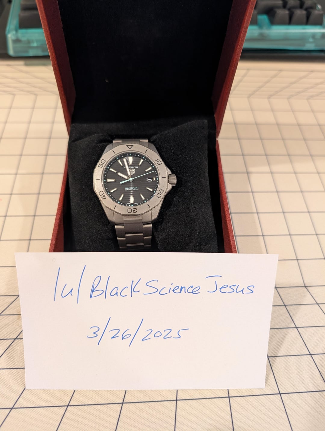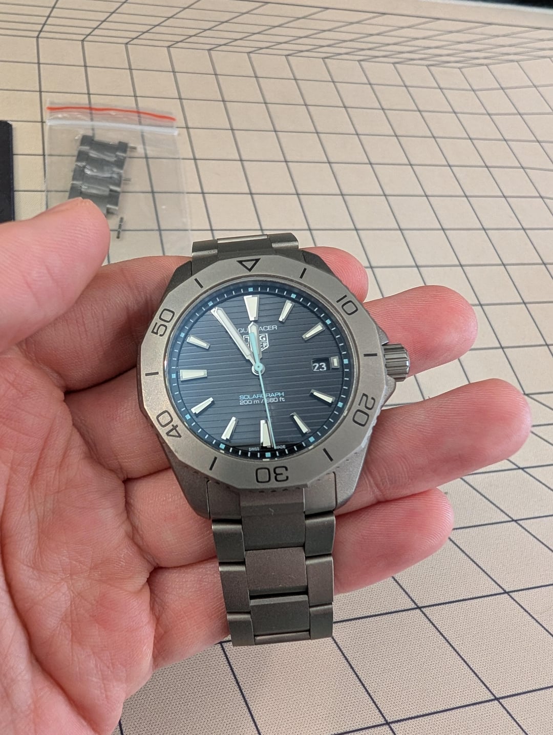 Looking for ~~$1850~~ ~~$1800~~ $1750 net to me after shipping and fees. Cheapest listing on Chrono24 is $2172 (not including tax and shipping). Not looking for trades at this time. The Solargraph is in great condition. Some very light desk diving marks that I tried to capture in the pictures, but the light has to hit it exactly right to even see it. The titanium case and bracelet are extremely durable. The lightness of the titanium also makes this a pleasure to wear everyday. The solar movement makes this a set and forget it watch. Just one minute of sunlight will give you enough charge for the entire day. Loved this watch but it's not getting enough wrist time anymore. Will come with the manual and international warranty. Watch was purchased on Feb. 24, 2023. Does not come with the original box, will ship in a generic watch box. More info can be found here - [https://www.hodinkee.com/articles/the-surprisingly-light-tag-heuer-aquaracer-200-solagraph](https://www.hodinkee.com/articles/the-surprisingly-light-tag-heuer-aquaracer-200-solagraph)