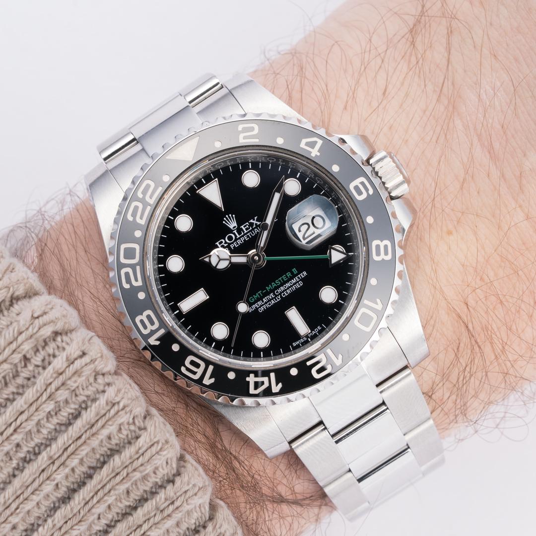 **Model**: 116710LN **Condition**: Excellent (little to no signs of wear) **Year**: January 2015 **Scope**: Box & Papers **Movement**: Automatic, Cal. 3186 **Case Width**: 40mm **Strap Length**: 8.00" **Listing ID**: 220001770 **Price**: Offered at $12,350 shipped. Wire, Zelle, or Crypto [Album](https://imgur.com/a/LD9Gzyv) | [Timestamp](https://imgur.com/a/5pxfcOv) **Our Take** There is arguably no travel watch more iconic than the Rolex GMT-Master II. In our opinion, the 116710LN represents the perfect daily watch. This particular model, being a late production model features the desirable blue chromalight lume. This GMT Master II Ref. 116710LN is in excellent pre-owned condition, with little to no signs of wear. The movement is keeping time within COSC Standards, and the watch received new gaskets ensuring proper water resistance. Comes complete with the original inner box, manual, 2020 RSC Service Papers, and 2015-dated warranty card papers.