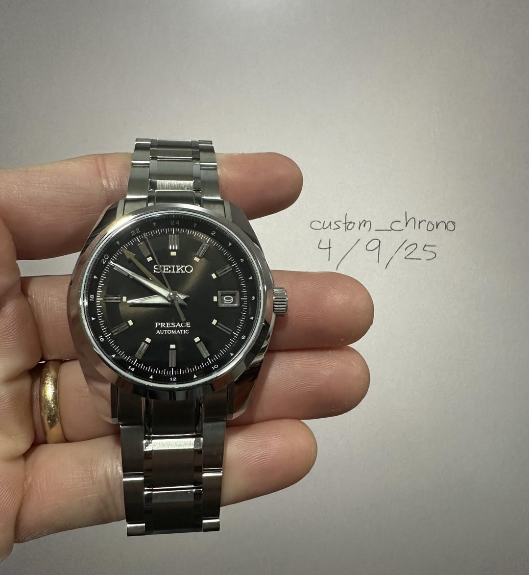 Hello all, i have a beautiful GMT seiko mod up for sale today. i’ve wanted do a “44GS” style build for a while and found a dial i think goes great with the overall aesthetic. the SARY215 dial is an absolutely beautiful dial that has hints of brown in certain lighting and a surprising amount of depth as well. i am using the amazing seiko NH34 to power this GMT and i have it regulated as well. case measures 40mm across, 45mm lug to lug, 12.3mm thick with 20mm lug width. has sapphire crystal and screwdown crown (and display caseback— totally forgot to include a pic haha) currently sized to my 6.75inch/17cm wrist with 4 extra links. oh and lume on hands and dial! i am asking $385 SHIPPED in CONUS. i take paypal and please add 3.3% to total if using goods and services, otherwise feel free to send the posted amount via friends and family. let me know if you have any questions as always