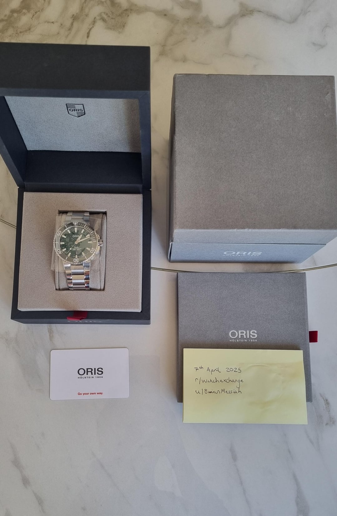Hi all, Up for sale (or trade) is my Oris Aquis Date 43.5mm with a vibrant green dial. It retails for £1950 ($2215) so this is definitely priced to sell at £999 ($1135). It still has the factory plastic intact and is a full set (the outer box, inner box, manual, warranty, and of course the watch!). Details: - 43.5mm (although it wears smaller thanks to the curved lugs) - Ref: 01 733 7730 4157-07 8 24 05PEB - Automatic (733-1 Caliber) - 300m water resist - Screw down crown - Sapphire Crystal - Ceramic bezel - Tapered steel bracelet - Link to website: https://www.oris.ch/en-GB/product/watch/aquis/aquis-date/01-733-7730-4157-07-8-24-05PEB I will ship fully insured. Any questions/enquiries/offers please comment first and then PM me. Happy to have a call to prove authenticity/ownership of the watch. Thanks!