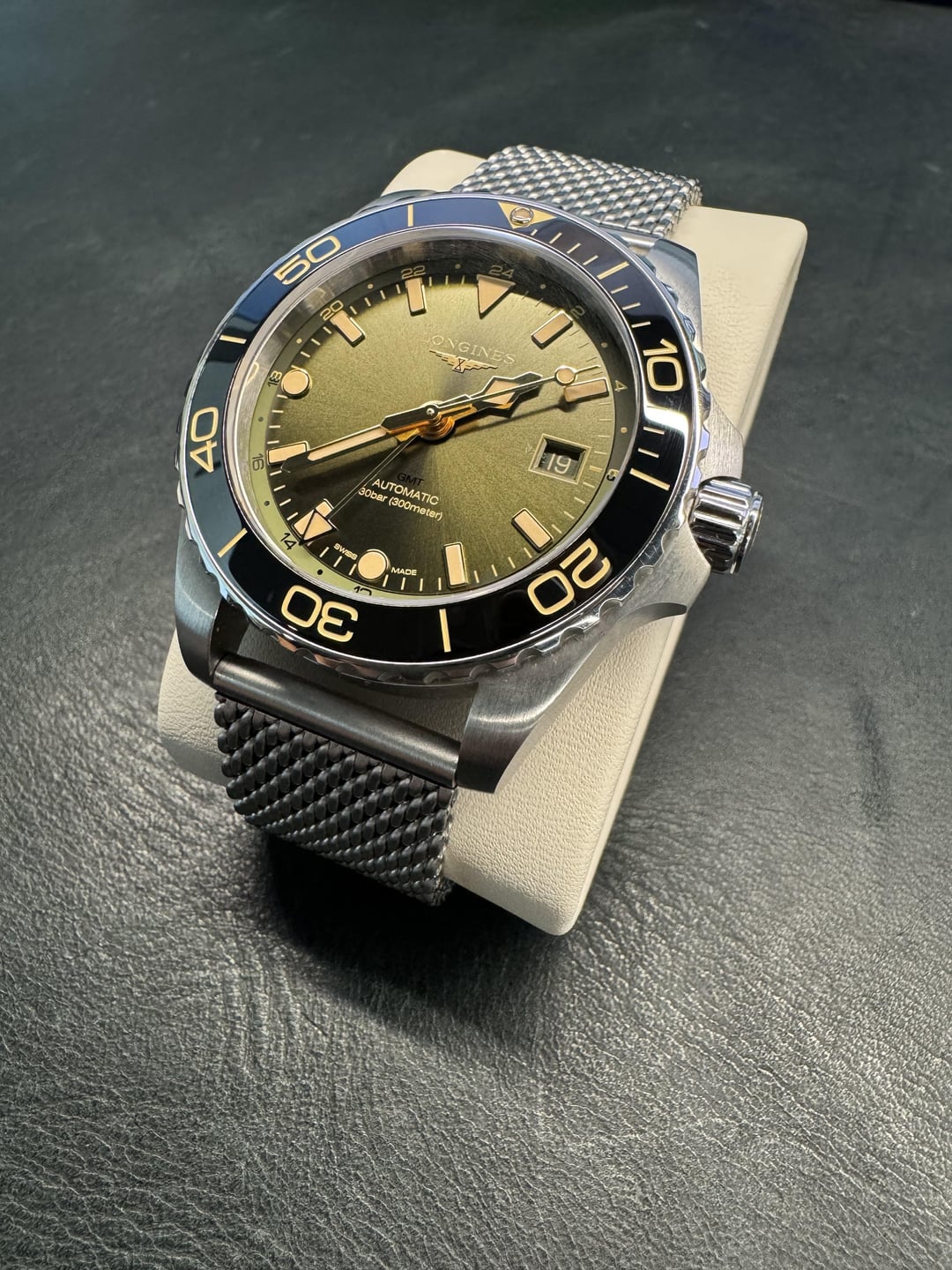Kit Includes: Double box, papers, warranty card, hang tag, and and course the watch with a sturdy strapcode mesh bracelet. Condition: Case, bezel, and crystal clean 9.9/10 . Minor desk rash on the bracelet clasp. Specs: Case Diameter: 41.00 mm Thickness: 12.90 mm Dial: Sunray Green Bezel: Unidirectional Ceramic Crystal: Sapphire (AR-coated) Crown: Screw-in Water Resistance: 300m / 1000ft Lug Width: 21 mm Movement: Caliber L844.5 Power Reserve: 72 hours Asking for $1575 + shipping through PayPal FF/GS, Zelle, Venmo, or pickup if near Austin