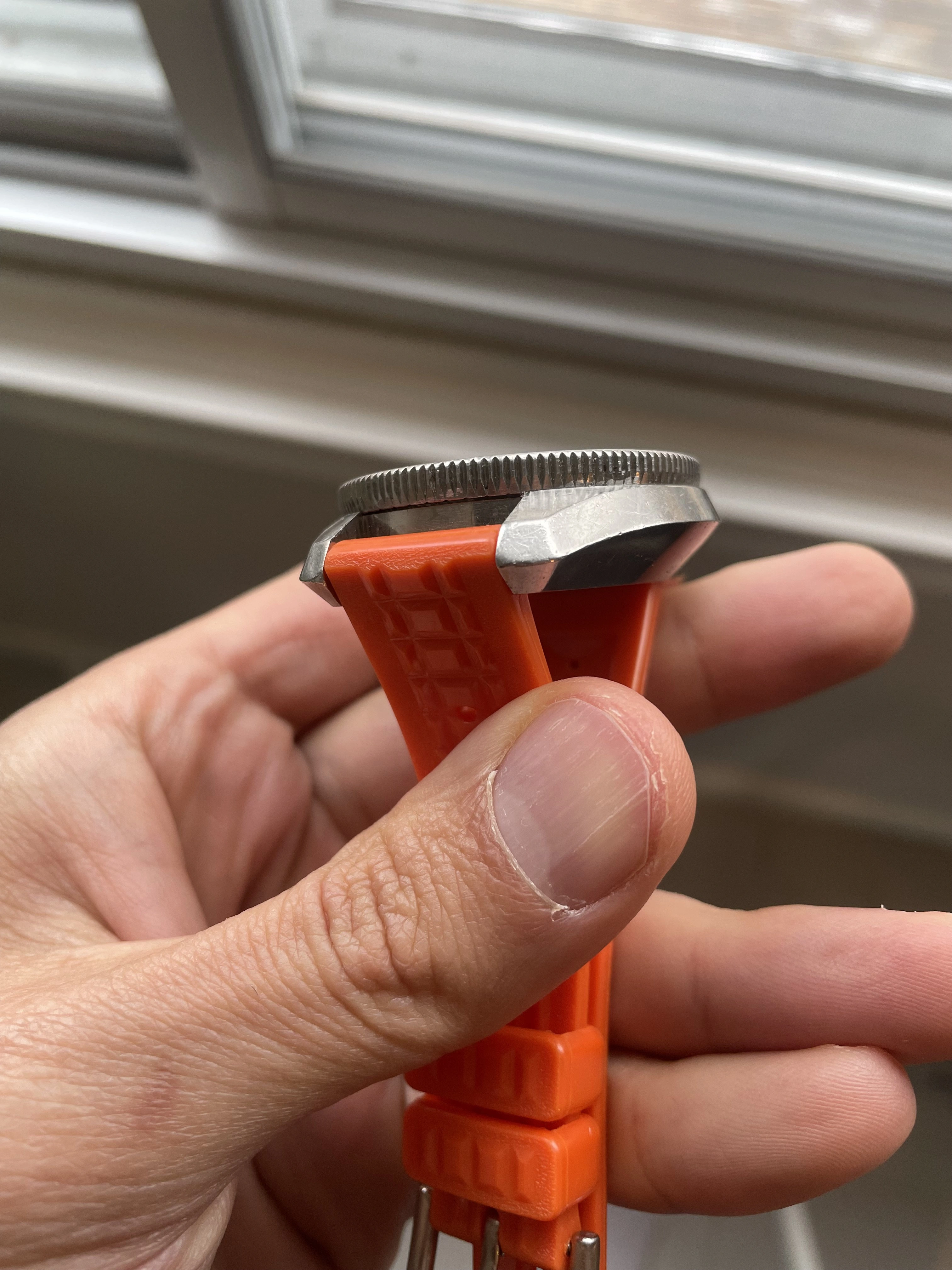 The case has scratches and dings here and there. The bezel clicks both ways as it should. The watch winds smoothly, sets time and date change as normal. Serviced April 2024 & pressure tested. The crystal was changed to a 1:1 replacement from Spencer Klein. Original crystal & Seiko waffle strap comes with the watch (very desirable). Watch comes on a new waffle strap from uncle seiko mounted on new fat spring bars.