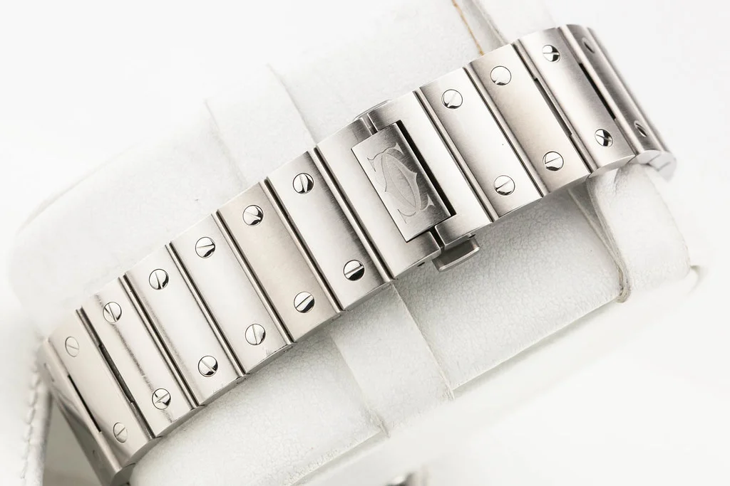 Up for sale is an excellent condition Cartier Santos De Cartier Large Size, reference # WSSA0018. It comes complete with all boxes, papers, booklets, hang tag, Smartlink strap and clasp, bezel guard and Cartier Warranty Card dated July 2024.