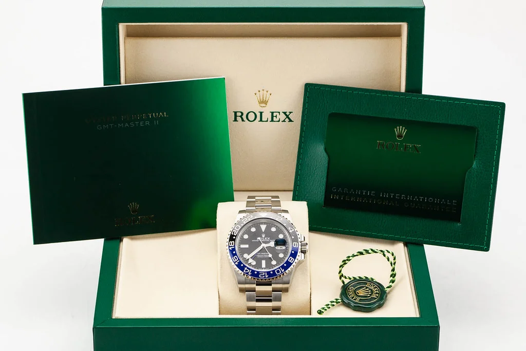 Up for sale is a brand new Rolex GMT Master II Batman on Oyster Bracelet, reference # 126710BLNR. It comes with all newly redesigned boxes, papers, booklets, hang tag, and Rolex Warranty Card dated March 2025.