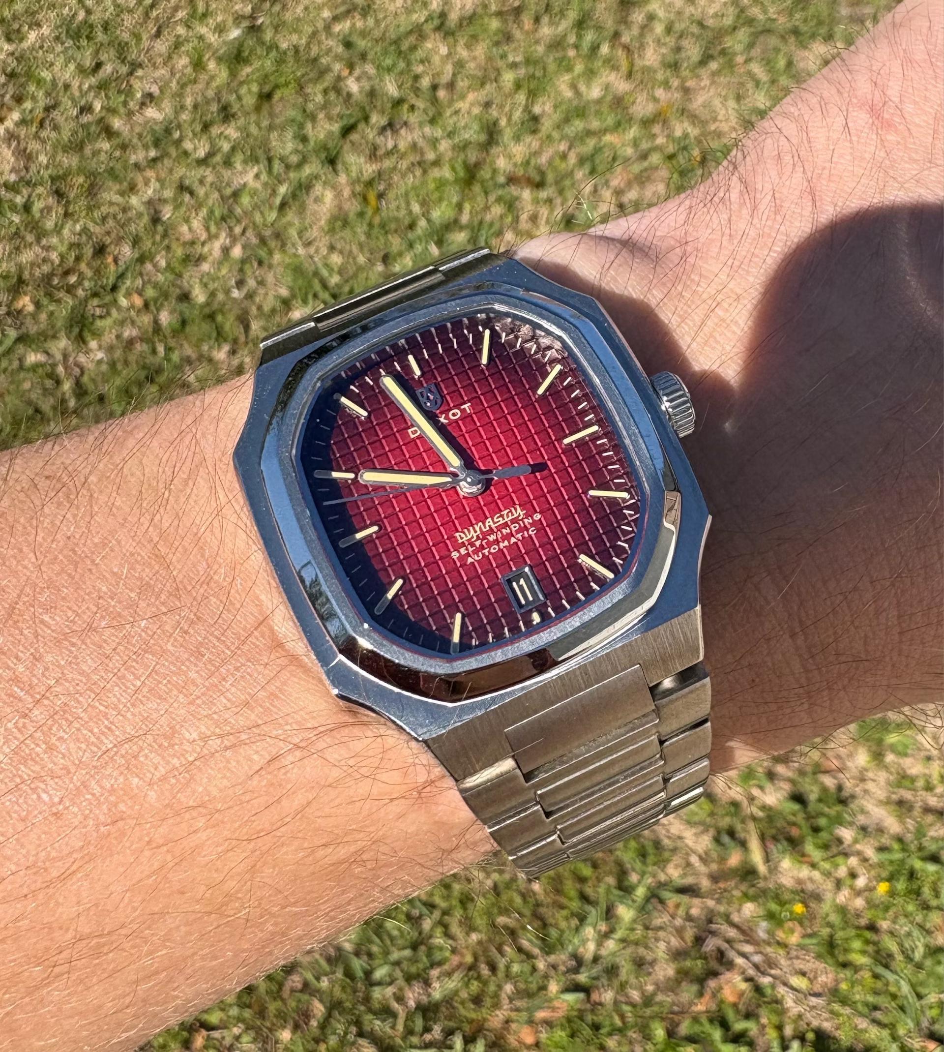 Enhanced timestamp to follow under auto-moderator comment Additional photo album here: [https://imgur.com/a/4iHElRT](https://imgur.com/a/4iHElRT) Selling my **Duxot Colmar in Burgundy**, a retro-inspired integrated bracelet diver with 200m WR and bold 70s design cues. It has a deep sunburst burgundy dial and a cushion-style case that makes it stand out. I picked it up out of curiosity, but it just didn't work on my dinky wrist. [Mfg website with specs.](https://duxotwatches.com/products/colmar-automatic-burgundy-dx-2069-11?_pos=20&_fid=7620c7925&_ss=c) It's currently on-sale for $179 on their website, having worn it a grand total of three times, I'm willing to part with it for $125 with shipping to CONUS. Payment: PayPal G\&S; Venmo or Paypal FF with sufficient references/purchase history here. Location: Florida Trades: It's not an expensive watch, but if it can go towards a discount on a Lorier Astra, orange Dan Henry 1975, or Kuoe Old Smith 90-007 with blued hands, I'm willing to talk.