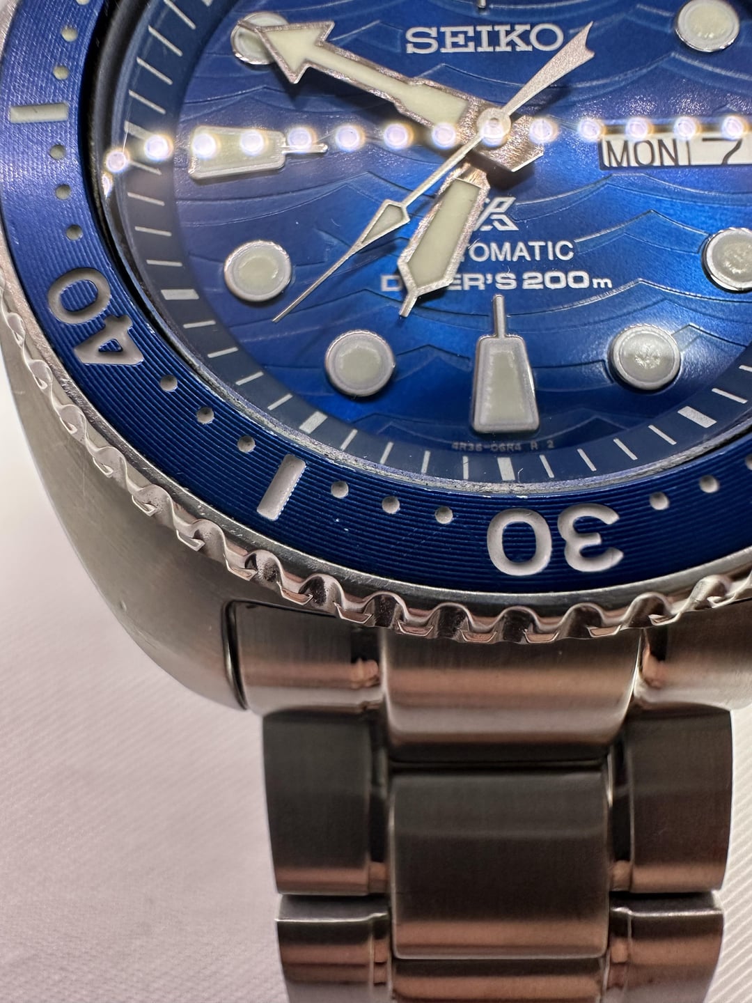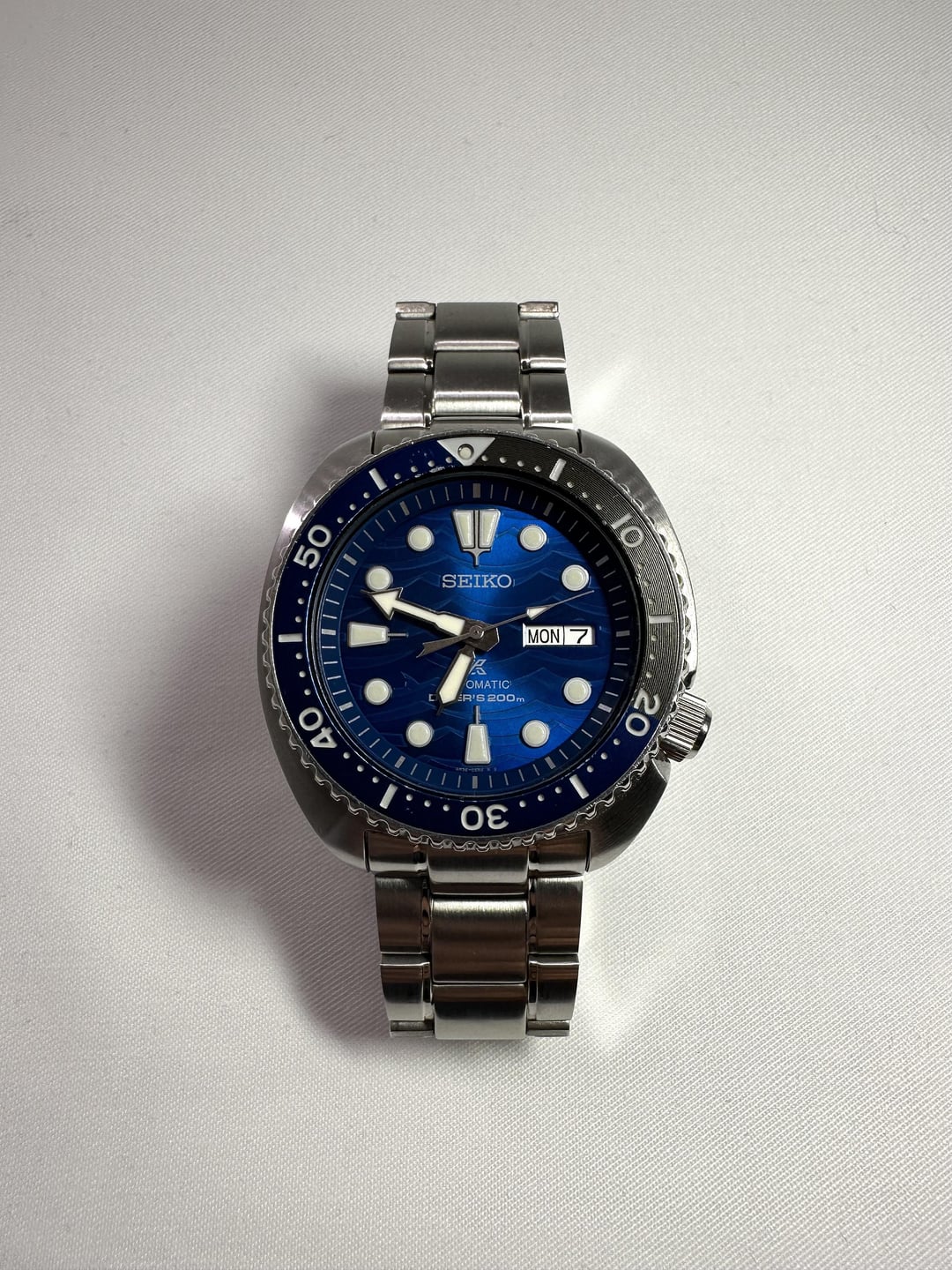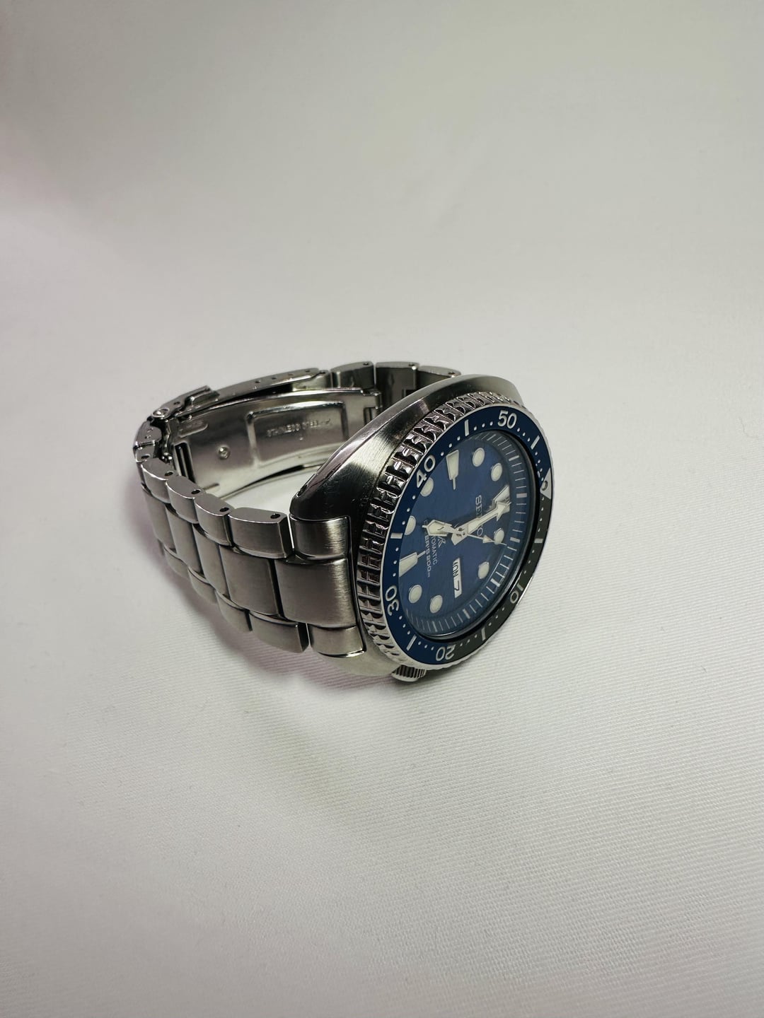 Timestamp: (See attached images in the post) Up for sale is my Seiko SRPD21K1, part of the Save the Ocean series. This modern Turtle diver features a striking deep blue wave-pattern dial inspired by ocean conservation. Details: • Movement: Seiko Automatic Caliber 4R36 (hacking + hand-winding) • Case Diameter: 45mm (excluding crown) • Lug-to-Lug: 47.7mm • Lug Width: 22mm • Thickness: 13.4mm • Water Resistance: 200m ISO-certified • Bezel: Unidirectional, 120-click, blue insert • Dial: Gradient wave dial in ocean blue Condition: Good condition overall. Small scratch on the bezel (see photos). Light wear on case and clasp. Runs well and keeps time within spec. Includes: Complete set – original box, papers, hangtags, all bracelet links, and two additional straps. Price: $344 USD — shipping negotiable Payment: PayPal F&F, PayPal G&S, or Wise Location: Netherlands Shipping: Worldwide shipping available
