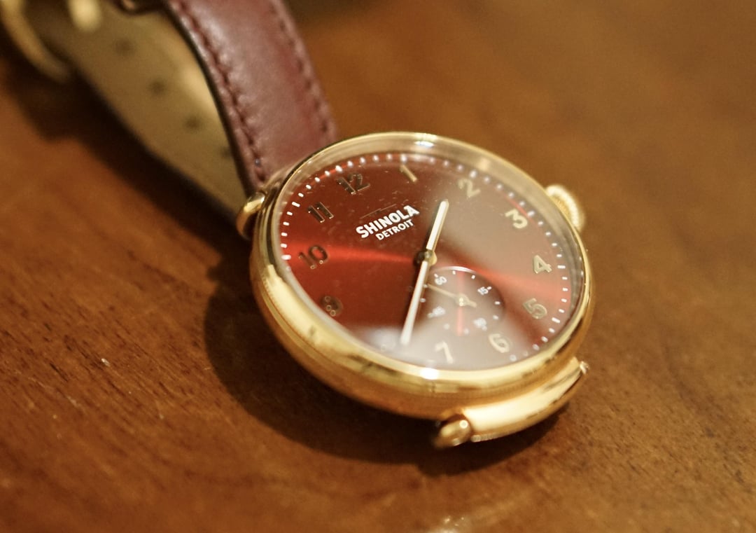 **Timestamp**: See photos above **Model**: Shinola Runwell **Movement**: *Argonite 1069* high-accuracy quartz, assembled in Detroit **Condition**: Great condition; battery recently replaced, runs perfectly **Notable Features**: Burgundy sunburst dial, sub-seconds at 6, domed crystal, gold-tone wire lugs and case — clean and bold Americana design **Shipping/Location**: Saratoga, CA **Price**: **$135 shipped** **Payment**: Zelle preferred; PayPal F&F, Venmo, Wise **Bundling**: Will pair nicely with the Rotary or Vaer for a dress/tool duo
