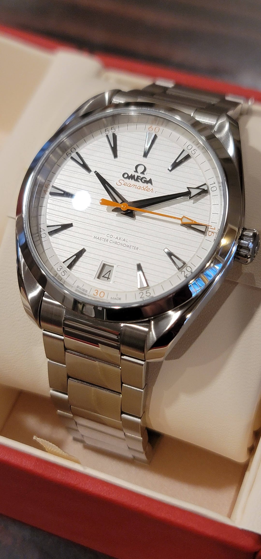 **\[WTS\] Stunning Omega Seamaster Aqua Terra Co-Axial 8900**[](https://www.reddit.com/r/Watchexchange/?f=flair_name%3A%22%244000-%244999%22) Omega Seamaster Aqua Terra 220.10.41.21.02.001 [\*\*\*IMGUR GALLERY & TIMESTAMP\*\*\*](https://imgur.com/a/omega-seamaster-aqua-terra-gallery-iADFdhx) For sale here is my Omega Seamaster Aqua Terra 41! This one-watch quiver features the Master Chronometer certified calibre 8900, 150m water resistance, and a truly stunning silvery-white teak pattern dial! The jumping hour hand, and industry leading anti-magnetism exceeding 15,000 gauss, make it the perfect travel companion. Included is the complete Omega shipping box, white outer box, wooden presentation box, red leather travel case, all links, serialized hang tag, leather card wallet including pictograms and master chronometer cards, and instruction booklet with the serialized crystal sticker in the back cover. I’m the original owner and have carefully worn this watch primarily out to dinner, and occasionally to my desk job. The watch is in fantastic condition and presents very well in person. There is a tiny ding on the outer edge of the 4:00 lug – difficult to see, but if you look carefully in the photos of the crown side of the case, you can see it. Otherwise, there are only light hairline scratches indicative of quite careful handling and wearing. I’ve done my best to use harsh lighting and angles in the photo gallery to be as illustrative of the watch’s true condition as possible, so please review the gallery and ask me any questions you might have. I’m asking $4199 Zelle or Wise, shipped overnight, insured with signature to the lower 48 (no trades please). Additional reference from within this community is also available on request.