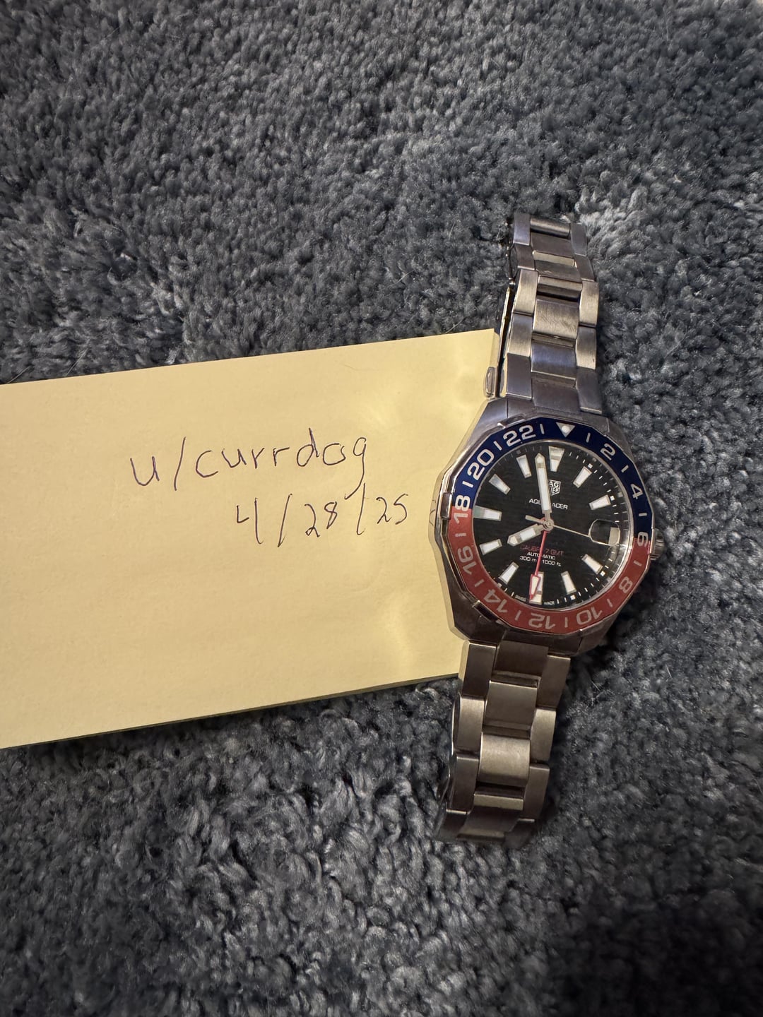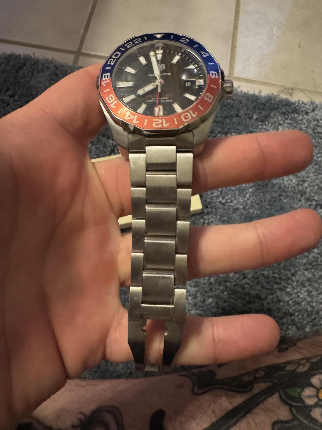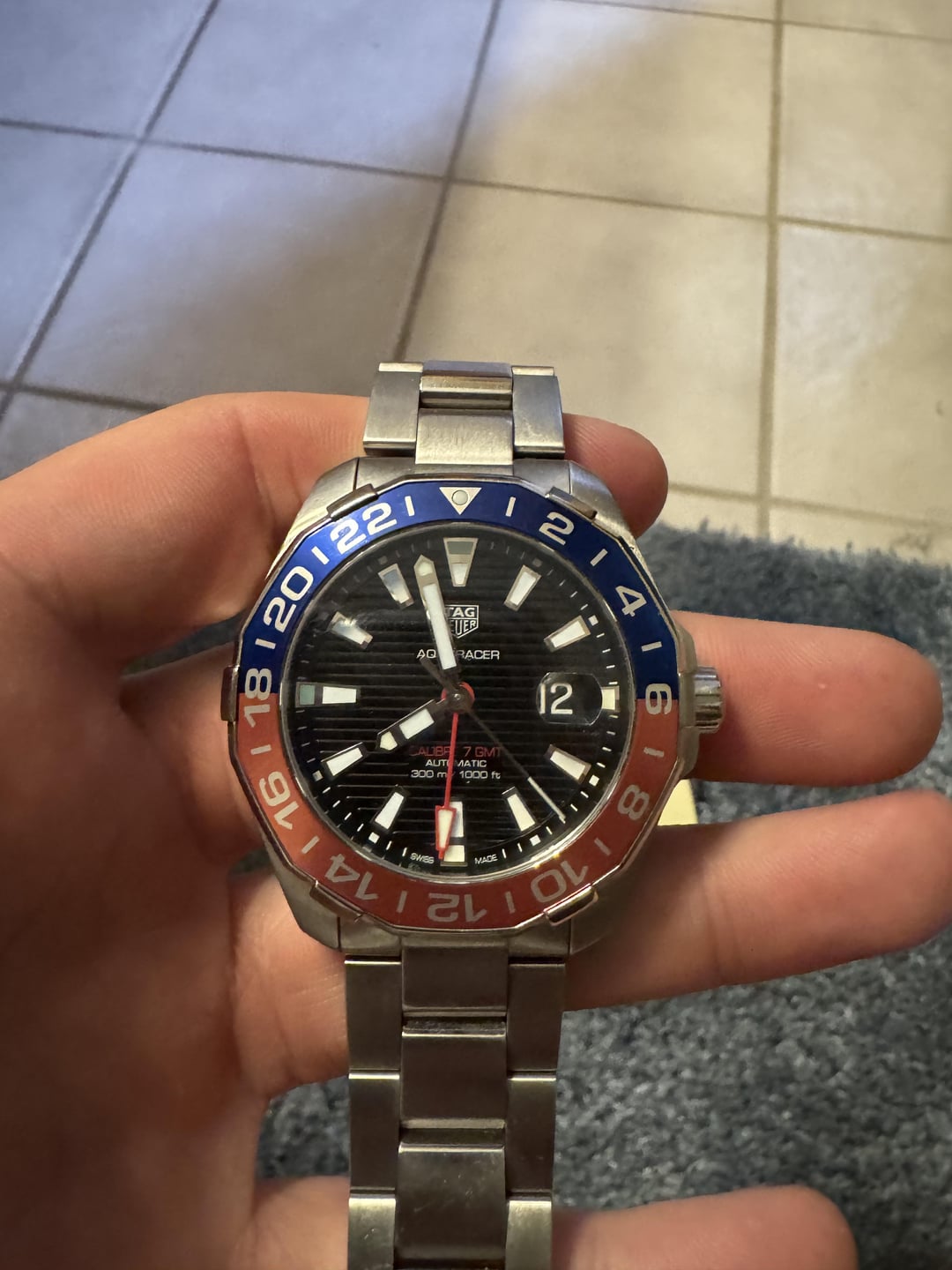 For sale is a like new Tag Aquaracer GMT Calibre 7 Pepsi Bezel. I got this watch from righttime in Denver a few months back, and while I love it, I just have some other things that I could put the money towards currently. Should still have about 9 months left of the righttime warranty. Comes with box and some papers but no warranty card. Watch is in excellent condition. Minor scuffing on the clasp, but nothing noticeable really, just like to make it known. Glass is clean. Date window is clear/clean. Works great! Please let me know if you’d like any additional photos, or have any additional questions. Looking for 2000usd shipped CONUS PayPal f+f or 2100 for g+s to account for the fee. Thanks for looking!