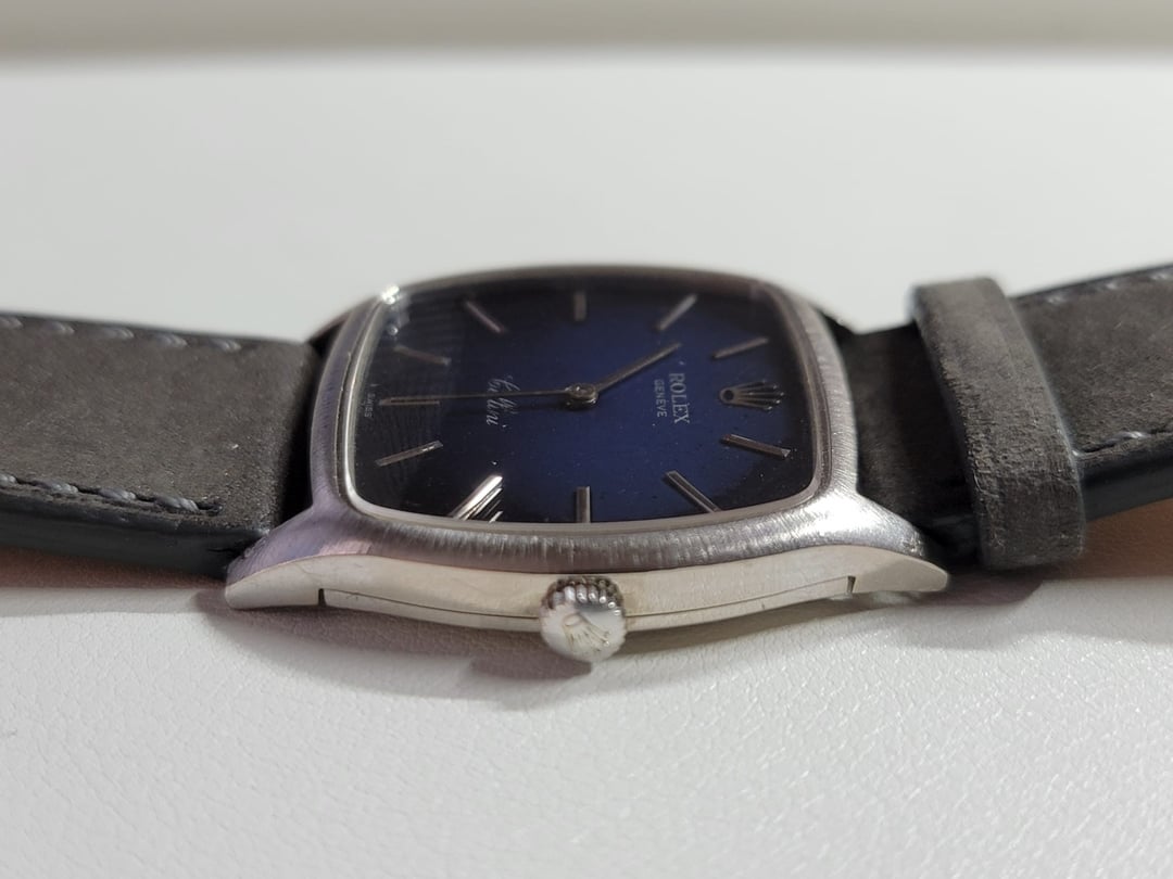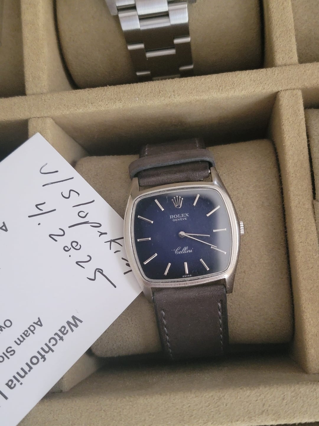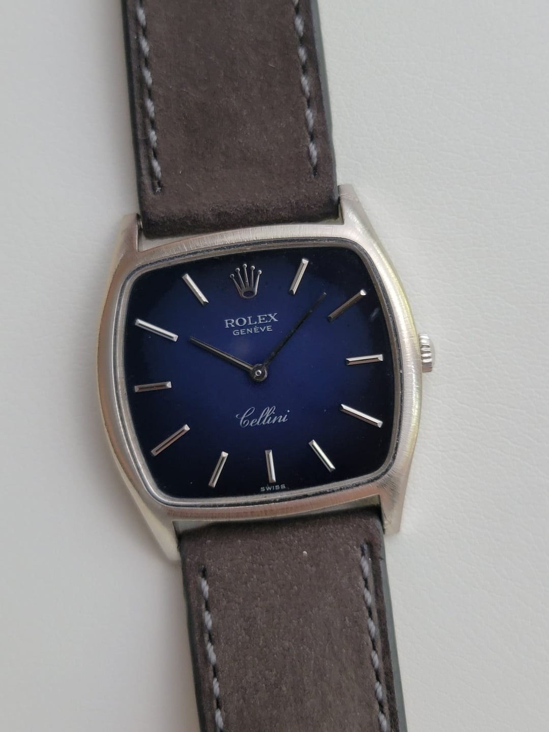 1976 Rolex Cellini Blue Fume Dial Tropical 18K White Gold Ref:3805 This watch is in great shape for its age. Unpolished condition with light wear showing throughout. The dial has a tropical hue on the the original dial that has been untouched. Comes on superb grey aftermarket strap with the original Rolex buckle. Comes as watch only. Case: 31x35mm - Lug Width: 20mm Price = $4,099 shipped Pics & Timestamp = [https://imgur.com/a/0nfrEyH](https://imgur.com/a/0nfrEyH) IG = watchfornia Cheers, Adam