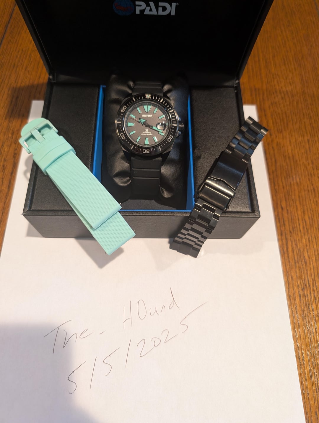 Up for sale: SRPH97K1 Seiko King Samurai Night Vision •Condition: Great overall condition. Small knick on the crown and another tiny one near 12 on the bezel. •Case: 43.8 mm Lug Width:22mm Thickness:13.2 mm Lug to lug:48.4mm •Movement: 4R35 •Includes: Full Box, original rubber strap, matching aqua strap, and new Strapcode Hexad Bracelet($127 value). Asking $510 net via PayPal or Venmo. I will cover insured shipping to CONUS.
