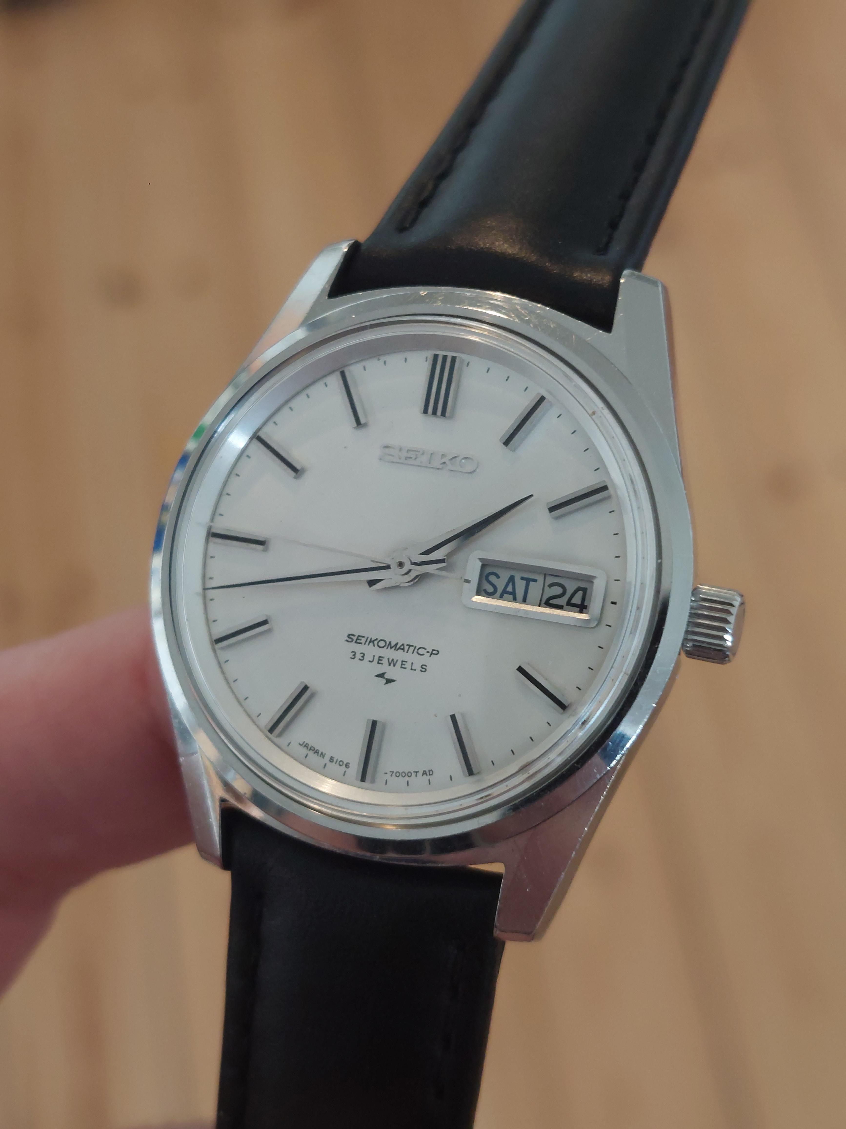 Vintage JDM Seiko Seikomatic-P 5106-7000, just serviced and in great working order. This is a JDM model featuring the 33 Jewel 5106A movement, a high quality movement definitely worth reading about: [https://adventuresinamateurwatchfettling.com/2016/11/12/a-technical-tour-de-force-seikomatic-p/](https://adventuresinamateurwatchfettling.com/2016/11/12/a-technical-tour-de-force-seikomatic-p/) All of the watches mechanical features function well, hand winding, hacking, instantaneous day/date change at 12, the date is changed by depressing the hexagonal pusher set within the crown, it is a little bit stiff, but works fine. Watch is keeping very excellent time. Watch is great condition as seen. The crystal has been replaced with an NOS crystal wduring service.. Case width is 34.5mm excluding crown, case length is 41mm lug to lug, watch height is 10mm and lug width is 18mm. Album: [https://imgur.com/a/67VXYp1](https://imgur.com/a/67VXYp1) Timestamp: [https://imgur.com/a/LBAcDHl](https://imgur.com/a/LBAcDHl) Selling for €280 or nearest offer net to me via Revolut/Paypal. Watch is in Copenhagen, Denmark. Shipping within Denmark for €12 or worldwide for €24.