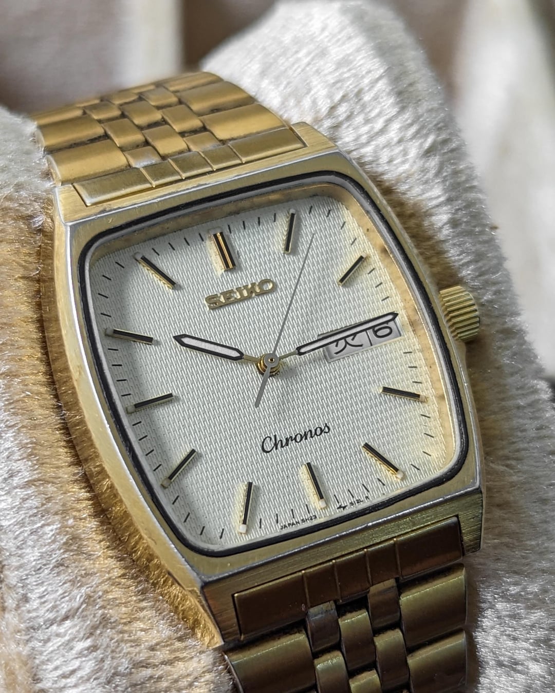 Timestamp: https://imgur.com/gallery/9Y8JTry Beautiful rectangular case shaped Seiko Chronos watch Ref. 5H23-5110 with beautiful radiator pattern in the dial. The case is SGP and has slightly discoloured/detoriated, but it is still a eye-catcher! This is a model made specifically for the Japanese market (JDM) so with Kanji/English day indication. 🔹Specifications ▫️Brand Seiko ▫️Model Chronos ▫️Reference 5H23-5110 ▫️Movement Quartz ▫️Caliber Seiko Cal.5H23 ▫️Crystal Mineral ▫️Case Material Base Metal ▫️Dial Ref 5H23-5120 ▫️Bracelet Ref GA40B-E 🔹Measurements ▫️Case Width 30mm ▫️Thickness 9mm ▫️Lug-To-Lug 36mm 🙌🏻 PM me for more photos or a video Price: $179 USD Shipping: $30 via UPS (5–7 business days) Payment: PayPal F&F or G&S (+4.4% paid by buyer)