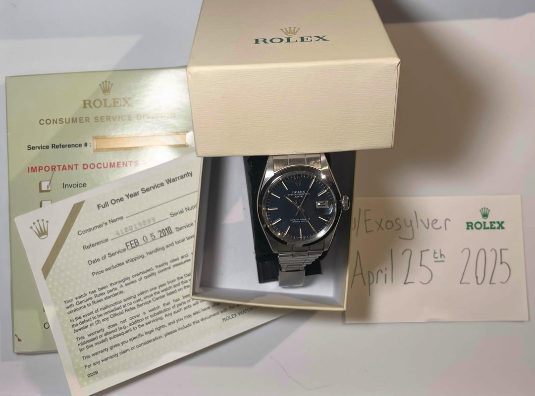 Beautiful vintage Rolex Date reference 1500, featuring a striking midnight blue dial and the rare Rolex 7205 Swiss Rivet bracelet with 57 end links. This classic timepiece, produced around 1969, boasts a 34mm stainless steel case with a smooth bezel. The watch is in great shape for its age, with some wear to the bracelet, and minor swirling on the case. Bracelet is pretty firm, with no excessive stretching. The dial is perfect, and the Original plexi crystal is nearly immaculate- some very fine hairlines, I had trouble trying to get it to show anything on camera. As always, make sure to inspect the photos and feel free to ask if you have any questions. Watch comes with Rolex Gift Box and the service warranty dated in 2010. Beyond my history here on reddit I have a long-standing seller account on ebay under the name thecrownejewels1 $2750 Shipping Included. Paypal F&F(or G&S+fees), Zelle, or Wire