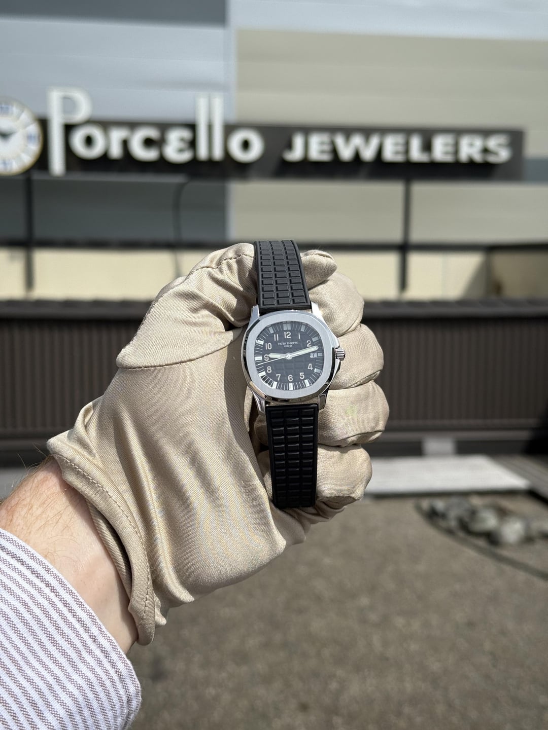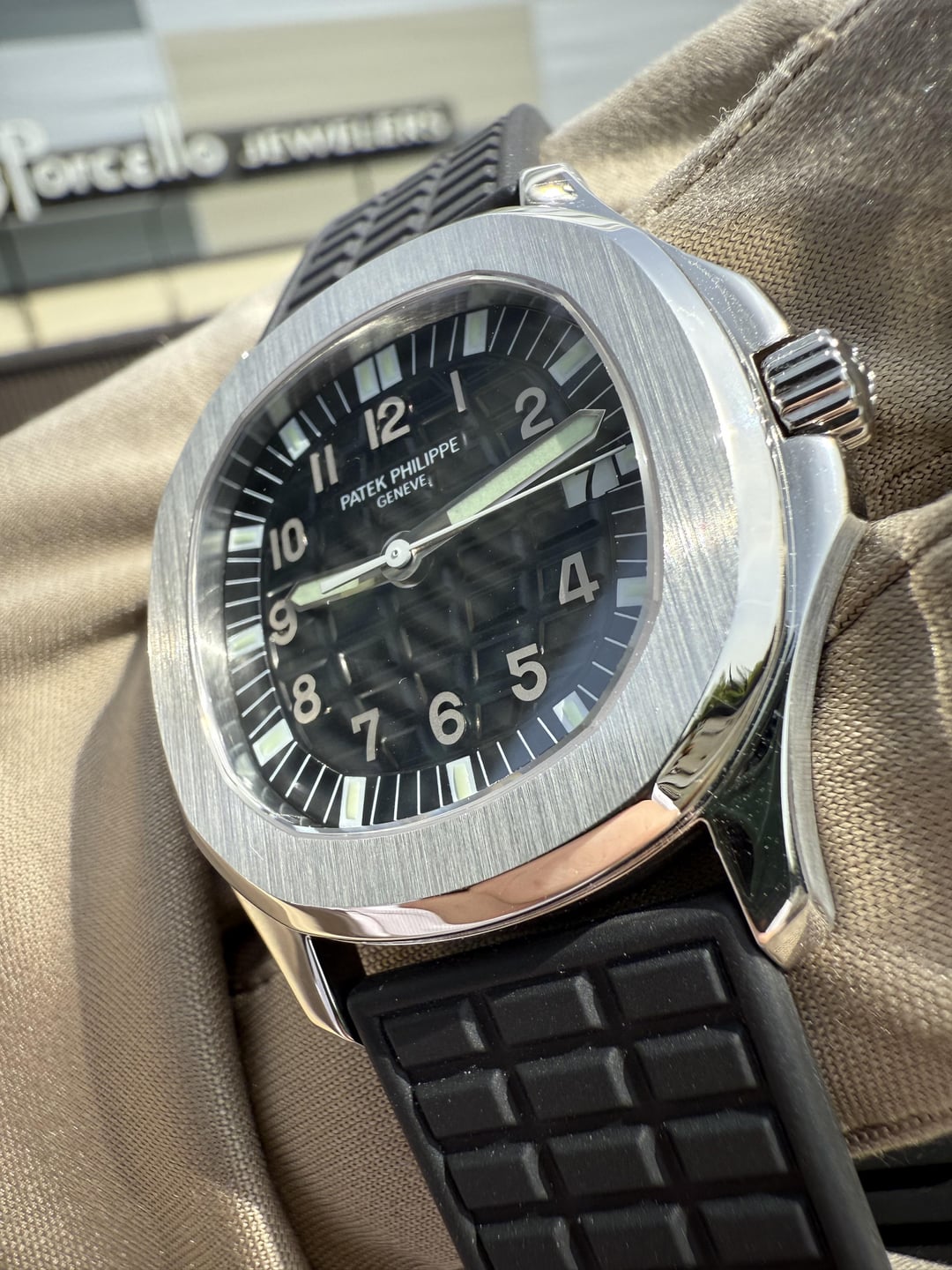 This would make the ultimate golf watch. Model: Aquanaut Ref# 5064A-001 Case Material: Stainless Steel Case Dimensions: 34mm Bezel: Stainless Steel Dial: Black Dial Band Material: OEM Black Patek Rubber Deployant Straps (one set uncut & one cut) Max Wrist Size: 9 in. Movement: Quartz, Battery Original Purchase Date: April 2005 Service Date: September 2024 Accessories: Service Box, Service Papers, Patek Leather Paper Holder Envelope, Original Papers & Service Papers Condition: Very nice preowned condition with some very light scratches on case, bezel and buckle Price: $25,300 shipped! Bank wire price. Can take cards for an added cost. WA Residents subject to sales tax. Email: [email protected] Instagram: porcellojewelers