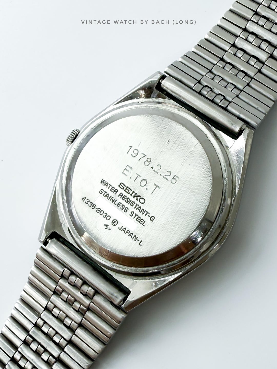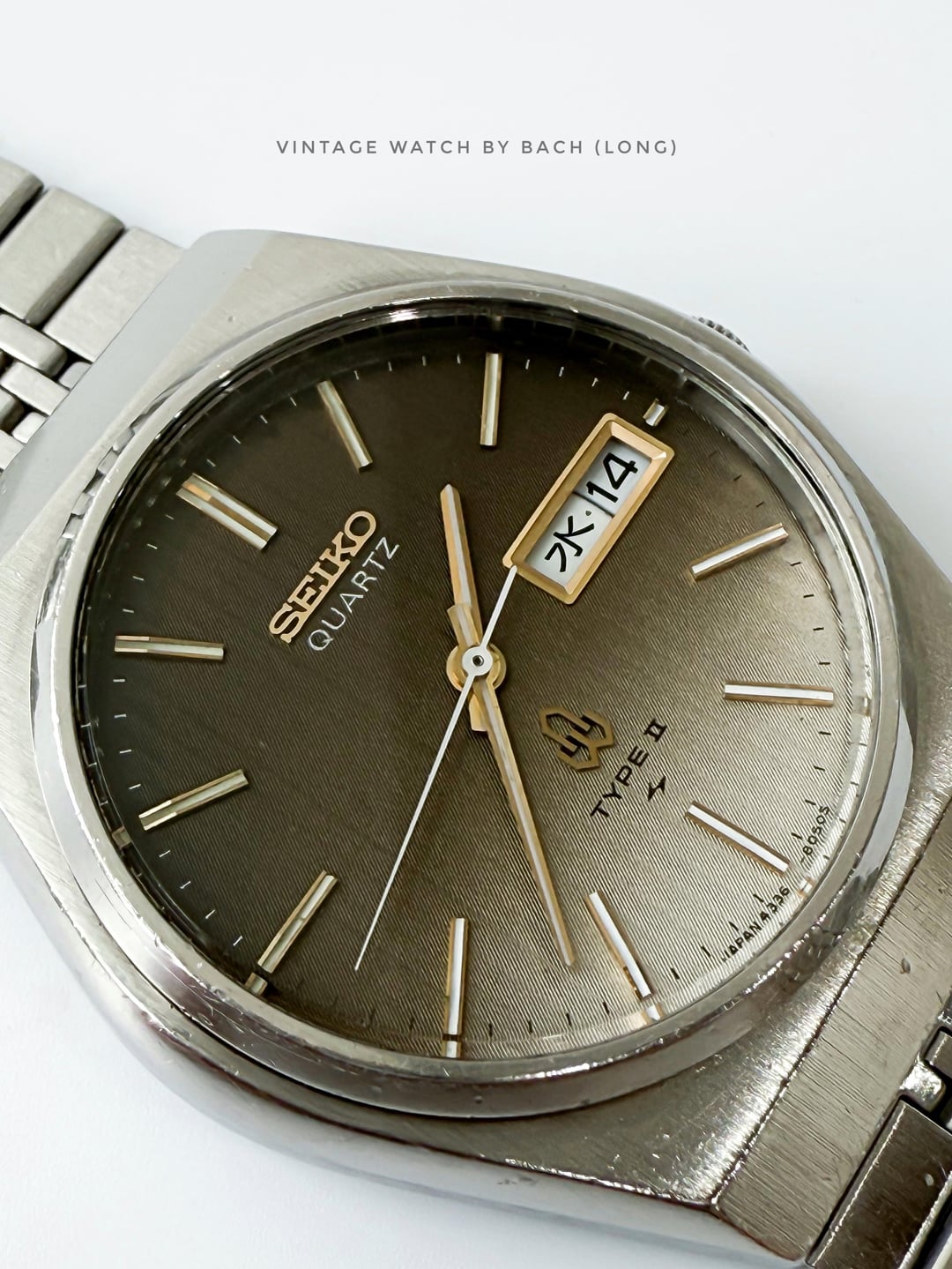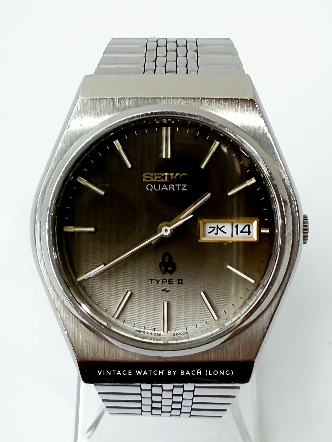 **Seiko Type II 4336-8030 Ombre Brown Dial** **SPECIFICATIONS:** \- Japanese Seiko Type II good condition from October 1977. Classic and vintage style. \- Stainless steel bracelet, fit up to 18cm wrist. \- Stainless steel case size 36mm (without crown), Lug to Lug: 41mm, Lug Width: 19mm, Thickness: 10mm. Suitable with all wrist size. \- Ombre brown dial. White and gold tone color of hand and hour markers. The color contrast not only enhance readability but also provide sophistication to this timepiece. \- Bold calendar box for Kanji/English day and date at 3 o’clock position. \- Monocrystalline quartz (see 3D logo applied at the bottom of the dial), which was only fitted to high-end models of the time: Grand Quartz, King Quartz, Lord Quartz, Superior Quartz, etc. **CONDITION:** The watch is well preserved for its age (See Photos). The case and crystal have some light hairline scratches. The original movement works well (keeping the time, changing the day and date). Serviced and replaced with new battery. Please note that only setting the date/day in 6-7 o’clock (safe time), must not change it in 9PM-4AM or that will damage the movement. Recommend to avoid getting wet for vintage watch. The watch has been tested for 1 month and operate stablely before selling. **SHIPPING AND PAYMENT:** \- Worldwide shipping via UPS (cost me 60-80 USD) with tracking number. 6-8 business days. \- Price 190 USD (free shipping). PayPal F&F or G&S (+4.4% transaction fee paid by buyer) \- Import duties and taxes are not included in the item price. These charges are the buyer’s responsibility. Please check this prior to buying. These charges are normally collected by shipping company (UPS). For more beautiful watches, visit: Etsy store: [https://vintagewatchbybach.etsy.com](https://vintagewatchbybach.etsy.com) Chrono24: Please DM for product links. Ebay store: [https://www.ebay.com/usr/vintagewatch\_bybach](https://www.ebay.com/usr/vintagewatch_bybach) Instagram: [https://www.instagram.com/vintagewatch\_bybach](https://www.instagram.com/vintagewatch_bybach)