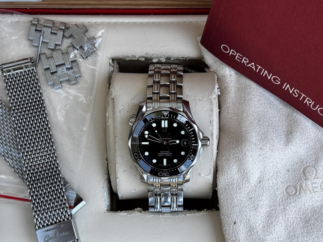 **Album:** [https://imgur.com/a/seamaster-36-co-axial-DJDTVxK](https://imgur.com/a/seamaster-36-co-axial-DJDTVxK) **Timestamp:** [https://imgur.com/kPfLiBO](https://imgur.com/kPfLiBO) Letting go of one of my top 3 watches—this beautiful Omega Seamaster Co-Axial 212.30.36.20.01.002, *no wave* black dial. The watch is in a nice used condition, keeping great time, and wears comfortably on the wrist. A modern classic. An elegant tool/sport watch, and what is now hard to find in the market. **Includes:** * Original Omega box * Manual/booklet * Bracelet, watch head (currently sized for \~6–6.5 inch wrist) * Extra links * Extra mesh bracelet if the buyer wants. This is a complete set minus warranty card and tag, and a great everyday or collector piece that stands out due to the no-wave dial variation. **Price:** $2,850 + shipping (CONUS, insured) **Payment:** Zelle or Wire preferred. PayPal F&F for established Reddit members. **Location:** Bay Area – local deals welcome and preferred. Please message me with questions or trade offers. I’ll be adding more pictures to my Instagram watch album if you'd like to see more. Thanks for your interest.
