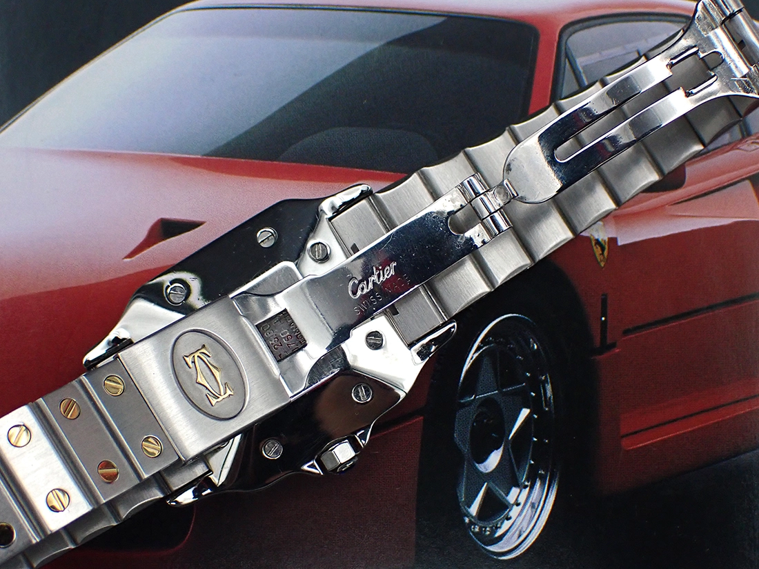 CROWN: Classic Near Mint Cartier seven-sided steel crown with blue sapphire spinel fits snugly against the case, winds the movement and pulls out to the quickset date and time setting positions exactly as designed.