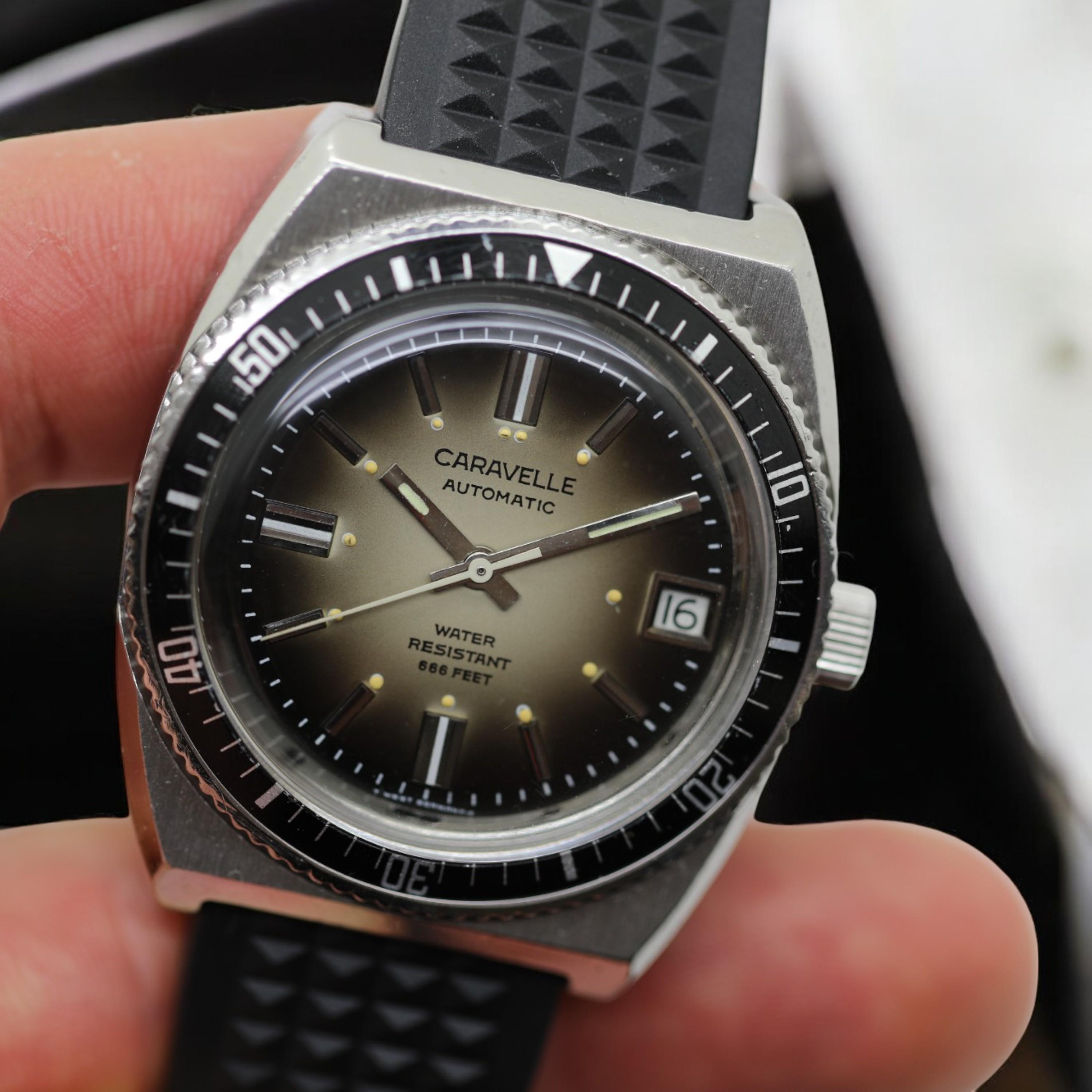 In 1962, Bulova introduced a new line of watches under the "Caravelle" brand name. Later in the history of Caravelle, the brand began to use movements manufactured in West Germany, hence the "T WEST GERMANY T" text below six o'clock on our example. You may see some Caravelle and Bulova watches referred to as "Devil Divers". This is due to their 666 feet of water resistance, as seen on the dial and caseback. Brand: Caravelle by Bulova Case: 37mm Lug to lug: 43.5mm Strap: Rubber waffle strap Box/papers: No Location: Los Angeles Price: $699 or make me an offer :) Web/IG: [keepiece.co](http://keepiece.co) Pictures: [https://imgur.com/a/ZdhSCF0](https://imgur.com/a/ZdhSCF0) Timestamp: [https://imgur.com/a/PBWuPql](https://imgur.com/a/PBWuPql) CONDITION & SERVICING \-The dial is in excellent condition. \-The hands and lume plots have aged to a creamy color. \-The sides of the case show wear and have been lightly polished. \-Service history is unknown.