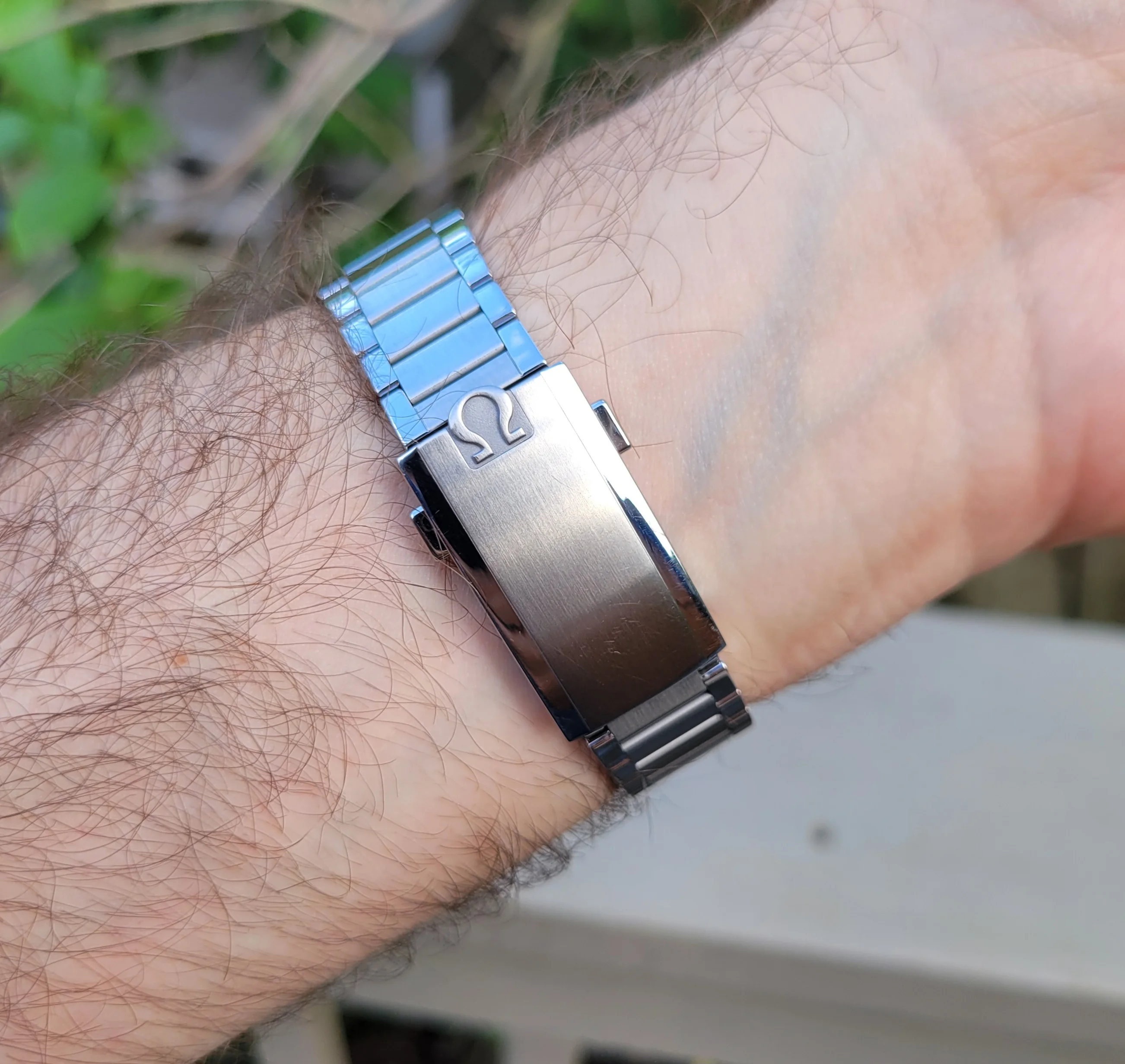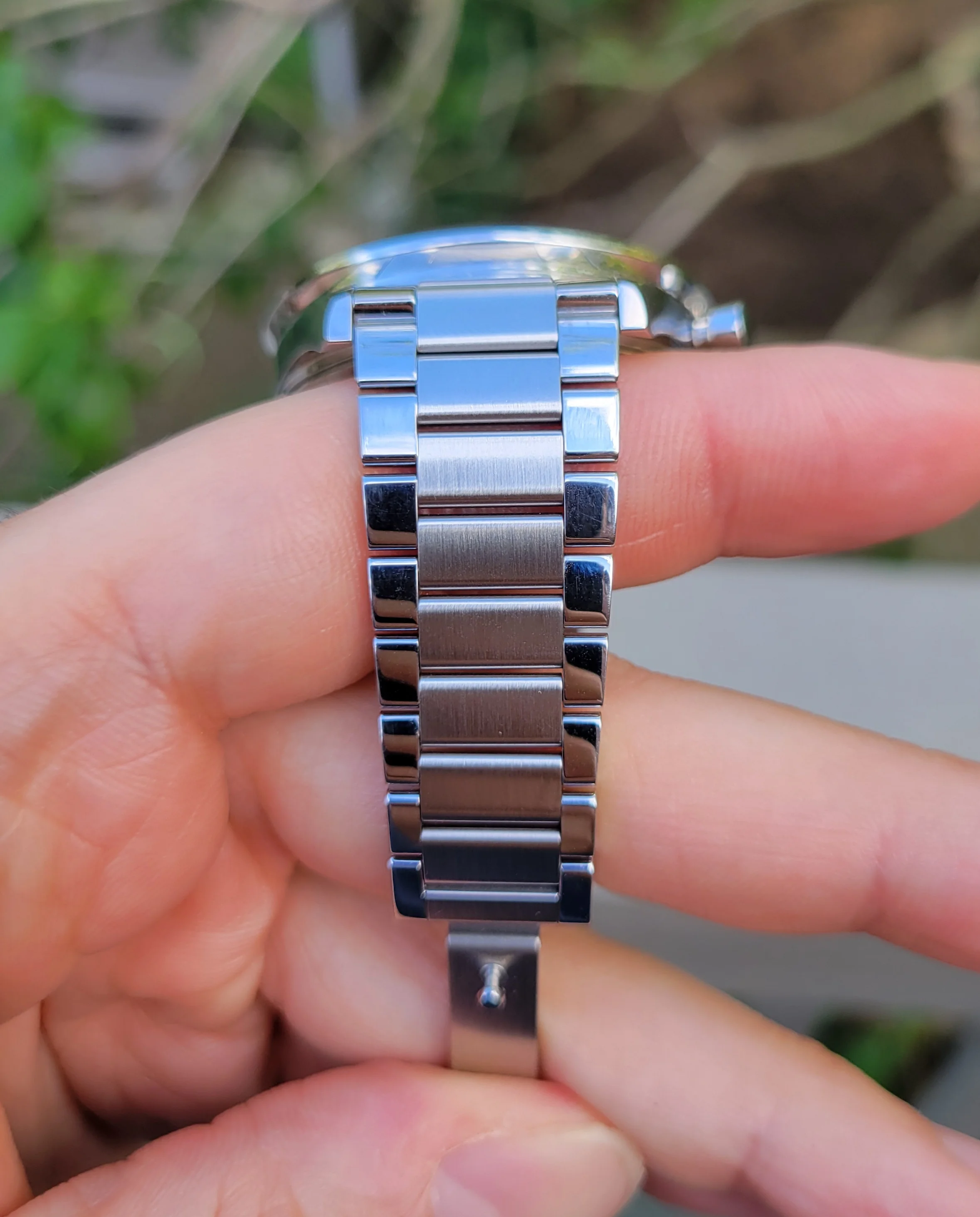 The watch was originally purchased in October 2024 and comes as a complete set with outer box, all inner boxes, all cards, extra links, booklet, etc. Overall, the watch is in excellent, lightly worn condition. The case and bracelet are excellent. There are a few tiny superficial scuffs on the clasp, which are seen at certain light angles. I circled these in a close-up image. I put a caseback sticker on the back since it is a highly polished surface. Mechanically, the watch is perfect with nearly all warranty time remaining.