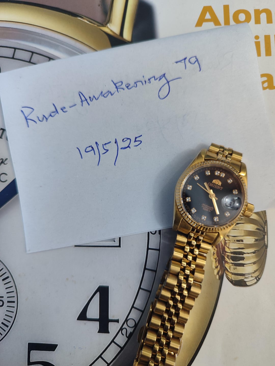 [WTS] Orient Diamond Dial Lady NR16N0B - Great Condition, With Box (Serviced) only for 250$ Shipped 🚢 (Via FedEx) Up for sale is a Orient diamond dial ladies reference NR16N0B featuring a stainless steel/gold plated case with a case size of 25mm. Condition of the dial is super clean with a beautiful black colour and diamond markers. Sapphire crystal. Comes on its original Jubilee bracelet with full links that would fit upto easy 7.5 inch wrist. Few links of the bracelet shows signs of wear from the inside. Automatic movement working perfectly fine with no malfunctions and keeping accurate time since its recently serviced. Watch & Box only (The box is damaged at the hinges ) Asking 250$ shipped Via Fedex Payment through Wise/Crypto/PayPal F&F only