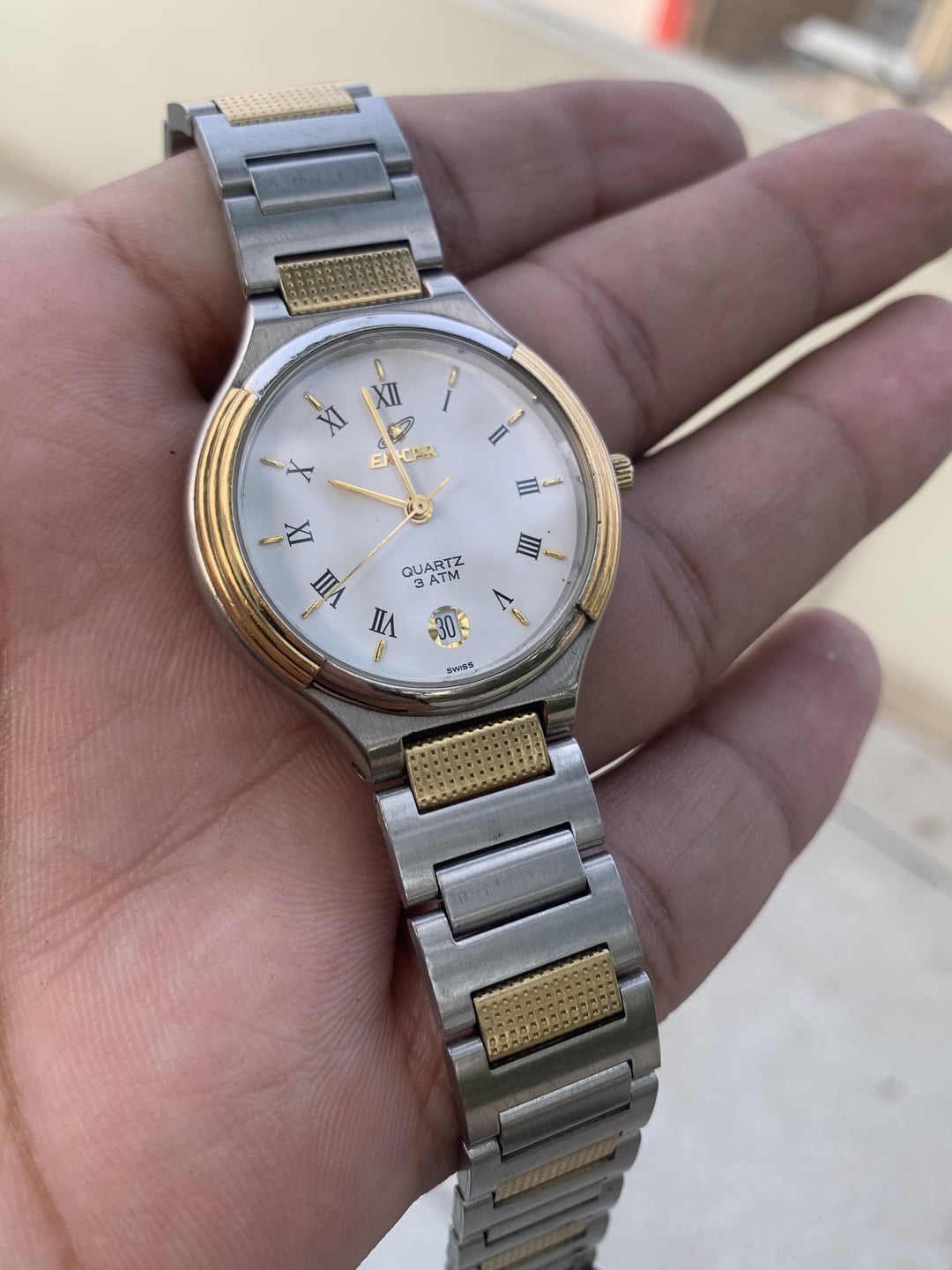 Timestamp : https://postimg.cc/0z1VYdyZ This Enicar 955.385 is a Swiss-made quartz wristwatch with a refined and elegant design. The watch features a white dial adorned with black Roman numerals at the 12, 3, 6, and 9 o’clock positions, while gold-tone hour markers are placed at the remaining intervals. The gold-tone hands are slim and minimal, with a central seconds hand completing the classic look. A date window is positioned at 6 o’clock, showing the number 30 in a yellow highlight, which adds a touch of color and contrast. The round stainless steel case is accented with a gold bezel ring, giving it a two-tone aesthetic. The case appears to be relatively slim and understated, likely measuring between 34 to 36 millimeters in diameter. The bracelet is also two-tone, with a brushed stainless steel finish and gold-tone textured center links that enhance the watch’s dressy appearance. The watch is marked as water-resistant up to 3 ATM, which means it can withstand splashes but is not suitable for swimming. Overall, the Enicar 955.385 is a stylish and vintage-inspired dress watch, suitable for formal or everyday elegant wear. Its design suggests it likely dates back to the 1980s or 1990s, a period when Enicar was known for producing well-crafted, Swiss quartz watches. PayPal and Wise are acceptable Shipping via UPS