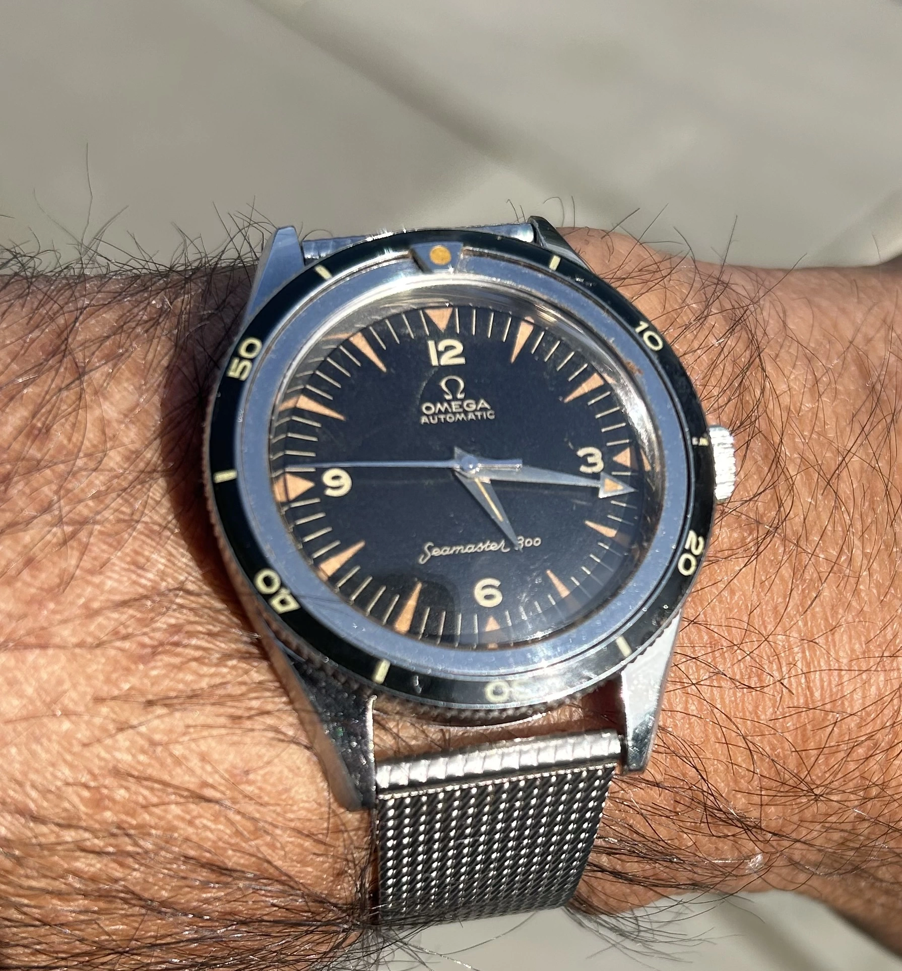 The watch itself is in great condition, lovely lume and aged dial, case is unpolished I think, and everyone I've shown it to says the bezel is original. Question on movement as it's an early number (15.3m) but that's never bothered me, the movement is excellent, and I had the watch serviced in 2020. You'll find out more if you search Seamaster 2913-6 on here, including previous listings and photos. I did sell it once before elsewhere, but the sale never completed. It comes with a vintage Omega mesh and I'll add in a couple of new new quick release leather straps.