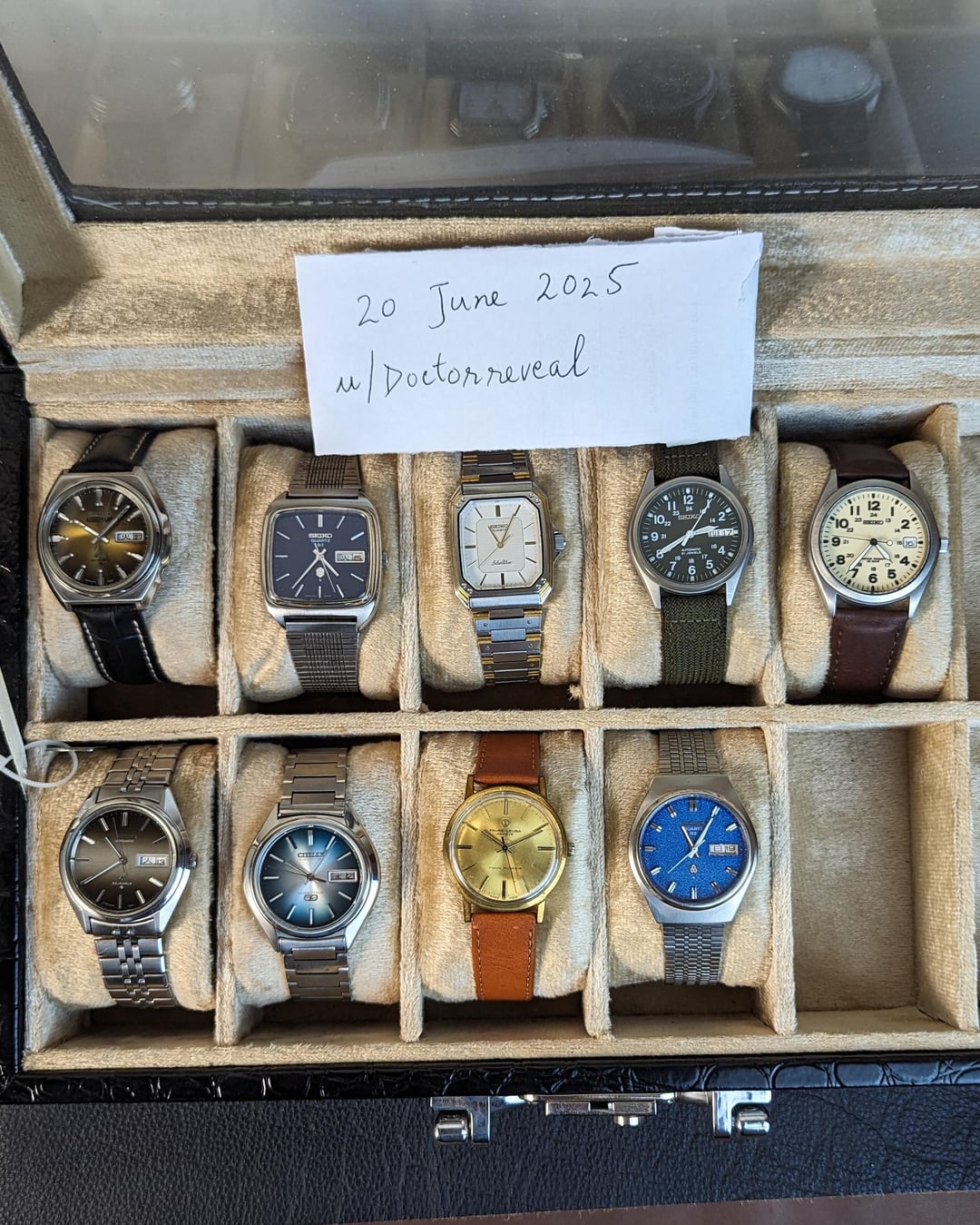 1) Seiko 5 Actus champagne dial - kanji day calendar 📆- $169 2) Seiko quartz QZ Blue sand glittery textured dial - 0923-8020 - kanji day date calendar - $249 3) Ultra rare Seiko Silverwave two tone bracelet - original bracelet - $259 4) Seiko green military automatic 21j kanji day date calendar - $249 5) Seiko radium dial - 7N42-8260 - $199 6) Seiko LM Coffee Cappuccino dial - 5606 mov. - kanji day/date calendar - $289 7) Citizen light blue dial kanji day date calendar $199 8) Favre Leuba twin power manual winding $129 9) Seiko Quartz QZ kanji day/date calendar - $279