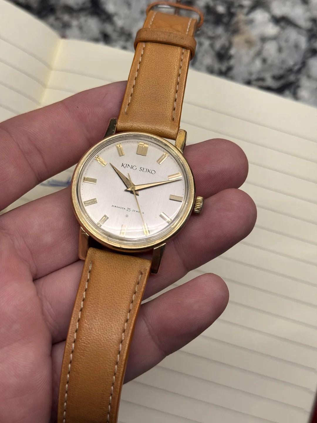 Hello everyone! Reposting from a couple weeks ago. Selling/Trading my King Seiko 44GS “Special Dial” made in the 1960’s. This is a very interesting watch. “Special Dials” have solid 18k indices and hands - they still sparkle beautifully today. This example runs great and winds smooth - it is very old and feels fragile but keeps time well. I would advise not daily’ing this watch and wear it gently. The dial feels like it needs a new spacer/holder - it sometimes wobbles when you wind the crown - but it doesn't affect usage or hand placement etc. The gold case is very thick and never polished - the crown is not original. Comes with a dark brown strap (I’m keeping the tan one 💛) Price $300 shipped CONUS (PayPal G&S) Trades: Open to anything! Timestamp + Photos: [https://imgur.com/a/2U4KenX](https://imgur.com/a/2U4KenX)