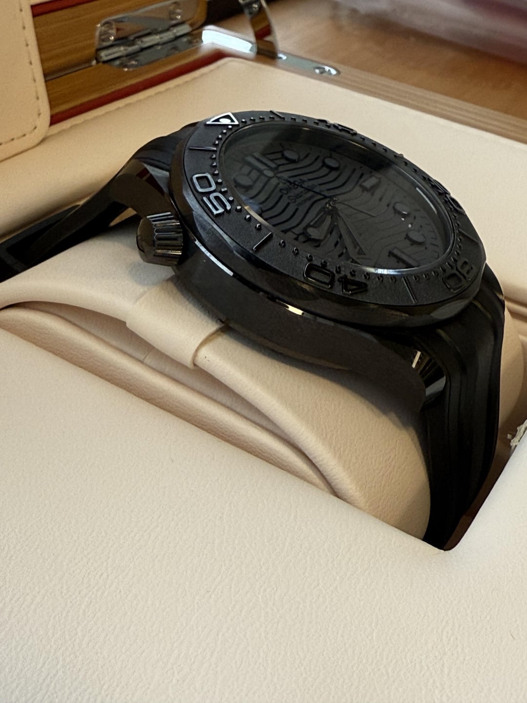 Hello WatchEx! On offer is my Omega “Black Black” I purchased a few months ago - however, the watch hasn’t been jiving with my “never seen sun” pinkish skin tone and I’m deciding to release this one back into the wild. Comes in incredible condition with full box, papers, warranty card dated 6/1/23, and an instruction manual in case you don’t know how to use a watch. To my eye, no scratches or signs of wear – the ceramic is quite hearty and has withstood my ~6 wears at the office like a champ. Omega currently lists this at a $9,500 MSRP but it is out of stock online and in my local boutique, for what it’s worth. It can be yours for $6,100 shipped domestically. Wire transfer or Paypal G&S (+% fee) only or local cash deal (SF Bay Area) at bank of my choice. Happy to facetime, jump on the phone, send additional photos. Case: Black ceramic Dial color: Black Crystal: Domed scratch‑resistant sapphire crystal with anti‑reflective treatment on both sides Water resistance: 30 bar (300 meters / 1000 feet) Total product weight (approx.): 114 g Caliber: Omega 8806 Movement Type: Self winding Power reserve: 55 hours