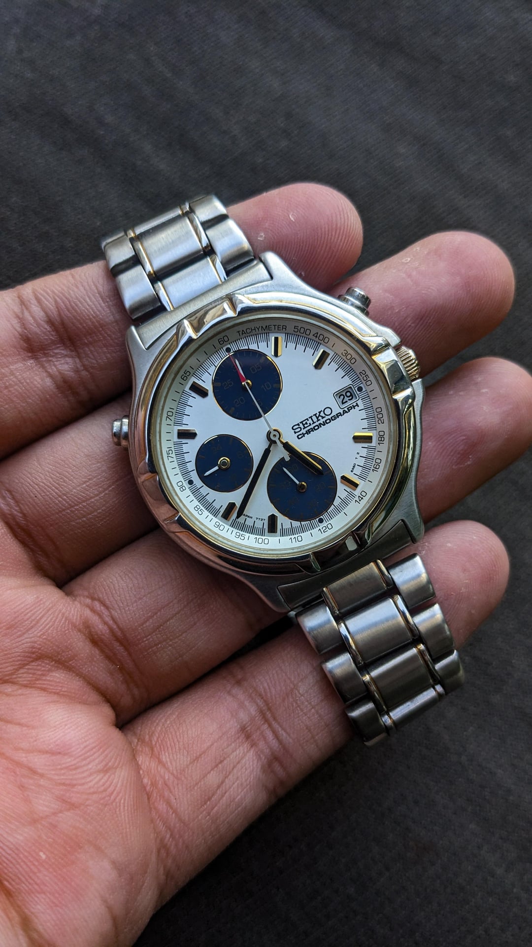 Hey watchexchange, Today I am selling my Bullhead Seiko chronograph sporty watch in good condition Overall with Quartz battery powered movement includes original bracelet of Seiko attached Timestamp: https://imgur.com/a/9WqrQqr *Case* * 35mm approx with crown * 38 mm approx Lug to Lug *Dial* * Bullhead style with 3 sundials * Sporty look with silver and blue tone *Movement* * Japanese quartz Seiko movement * 7t72movement reference production 1990's * not serviced *Bracelet* * can easily fit UpTo 7.2 inches and leather can also be integrated for bigger wrists . *Price* • 145$ shipped (Worldwide Delivery 🚚) ° Comment here before sending pm ° watch condition is as shown in the pictures