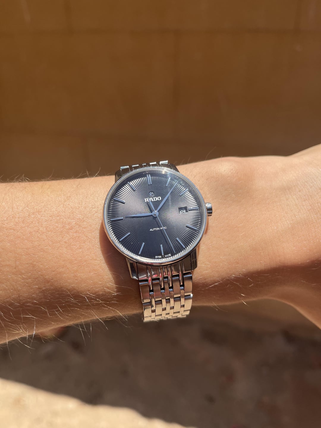 Selling a beautiful automatic Rado Coupole 38mm with a black sunray dial for $739 shipped. This watch has a 50m water resistance, sapphire crystal, and a decorated movement with a personalized Rado rotor. The watch is currently sized for a 7 1/8 inch wrist and comes with one extra link. The watch has a killer dial, and is suited for both casual and formal occasions. I'm happy to provide additional pictures.