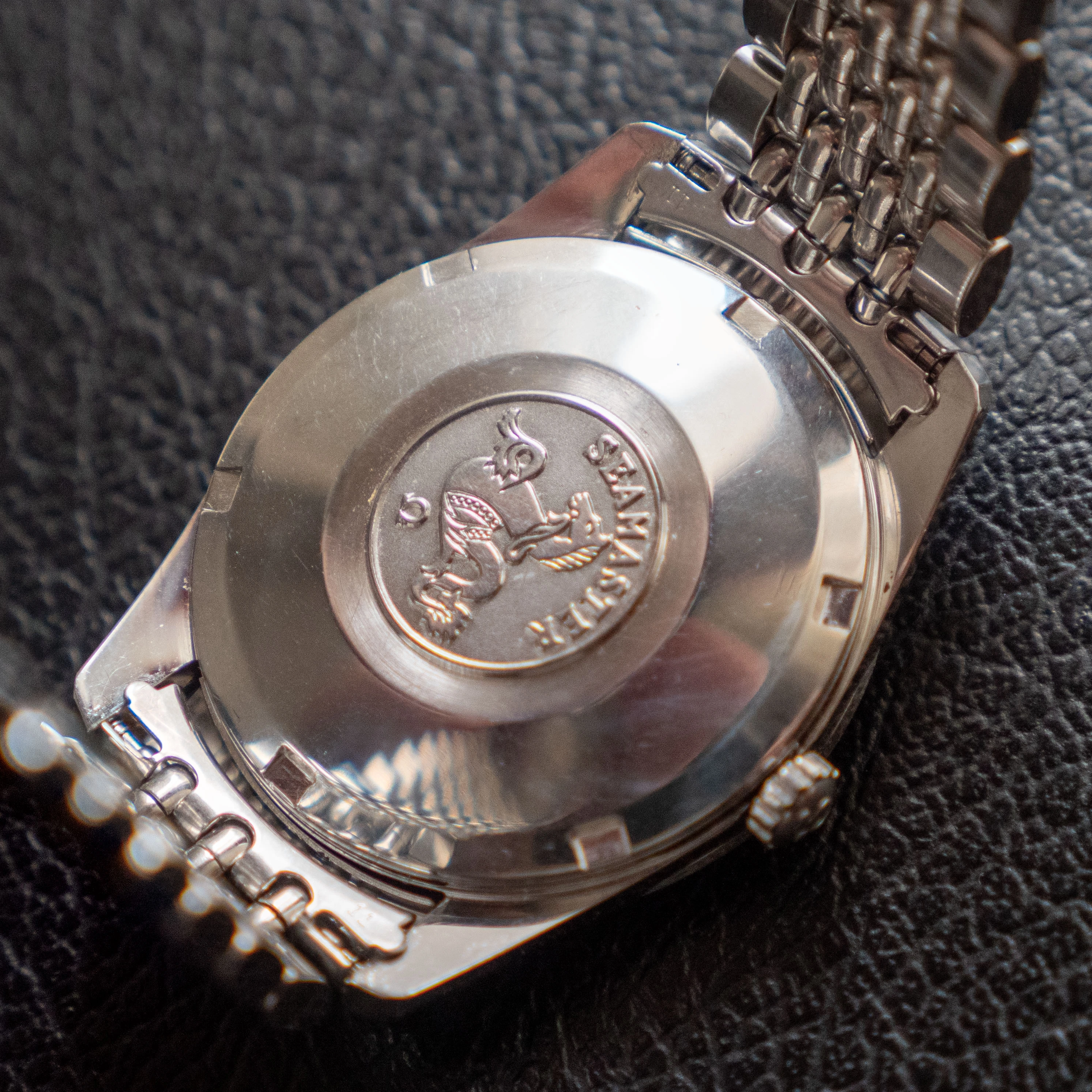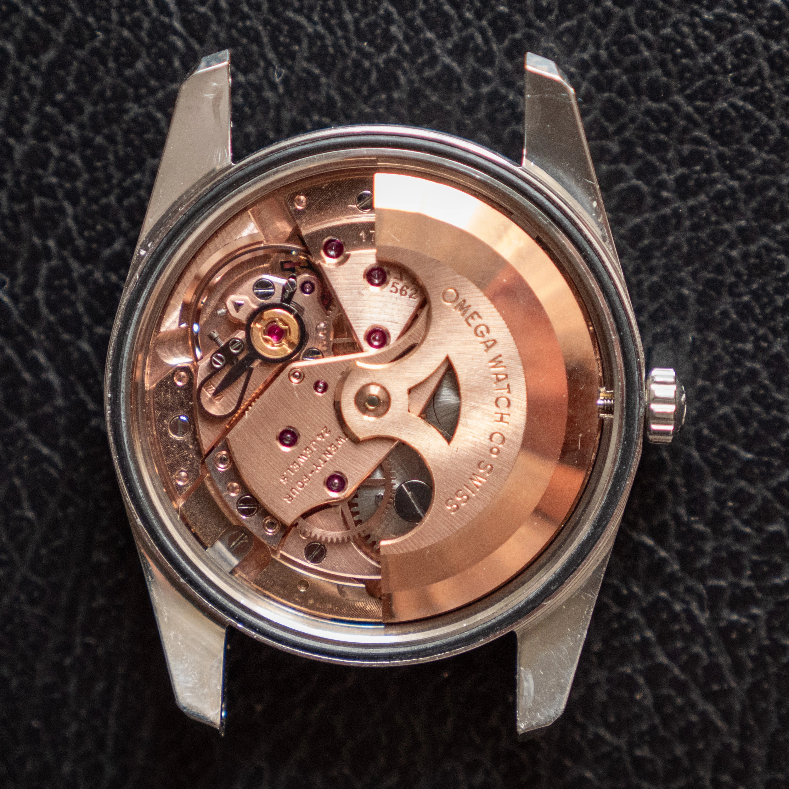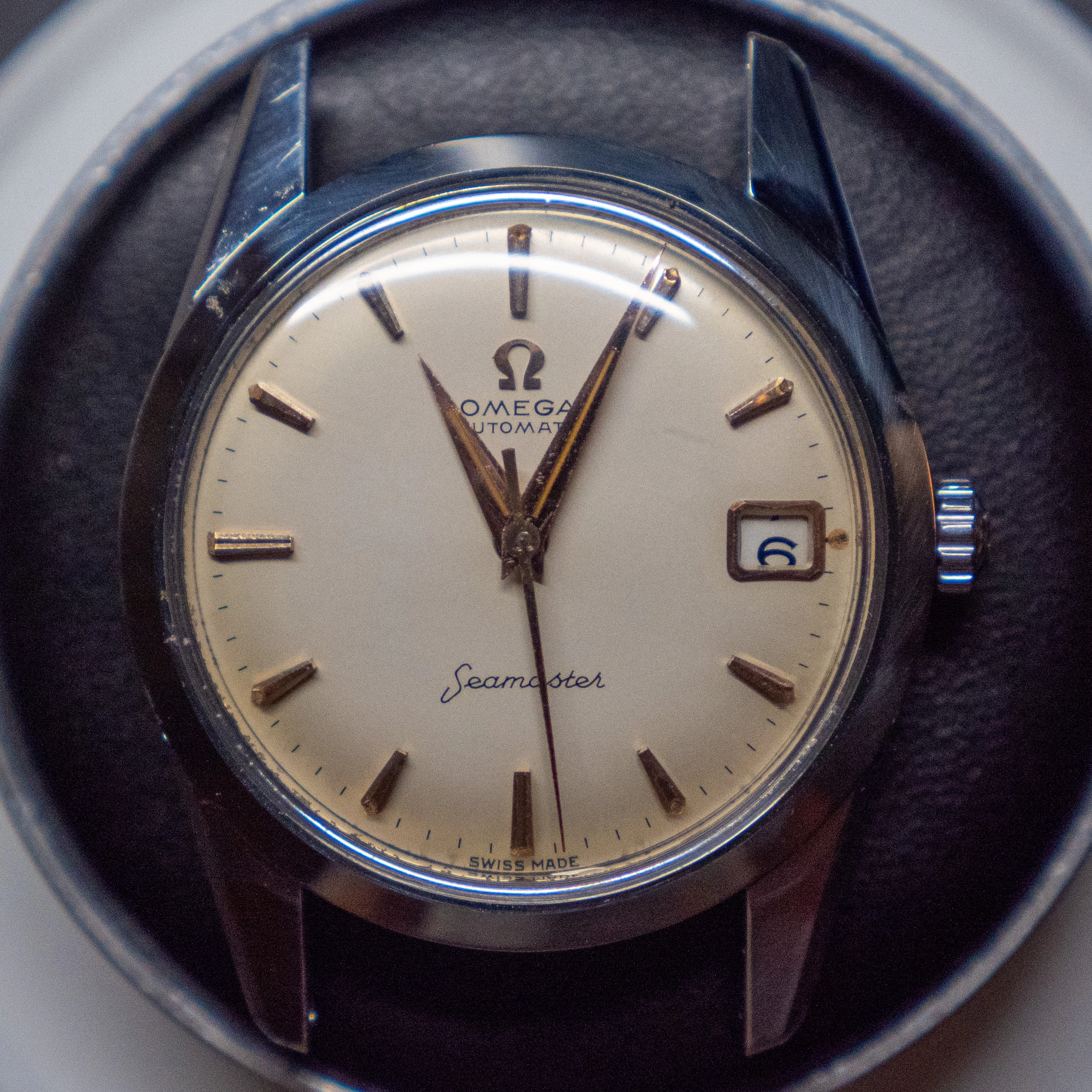- The glass is an original omega part with the little logo stamped on the center. It has some scuffs around the 2 o'clock position - I havent been able to polish them off.