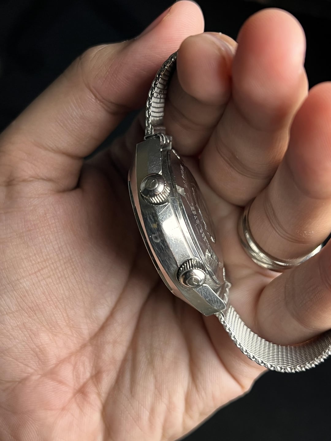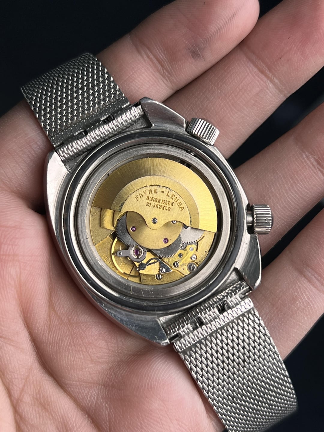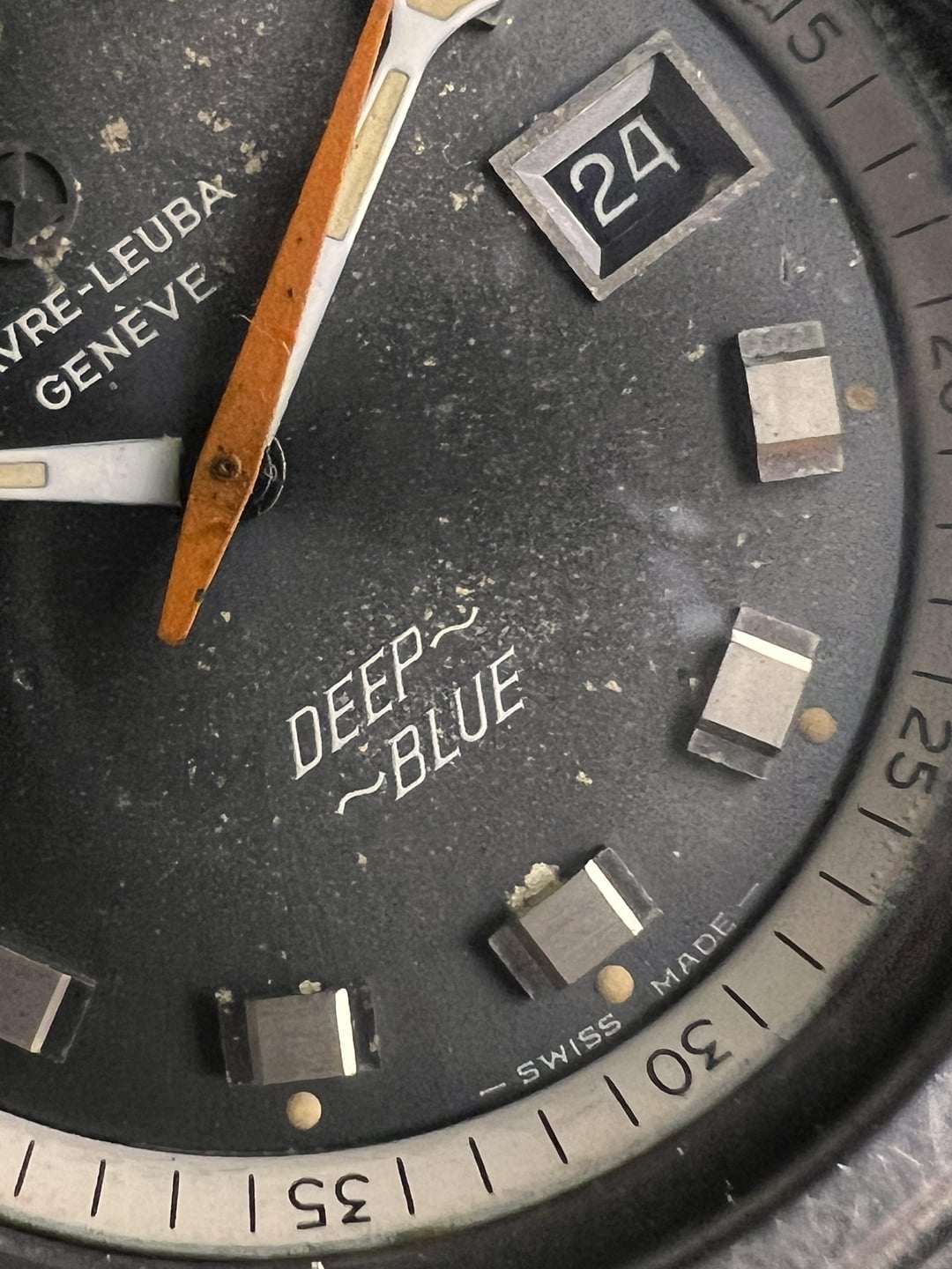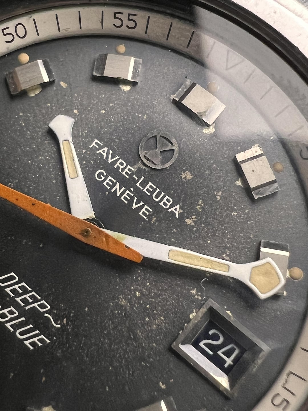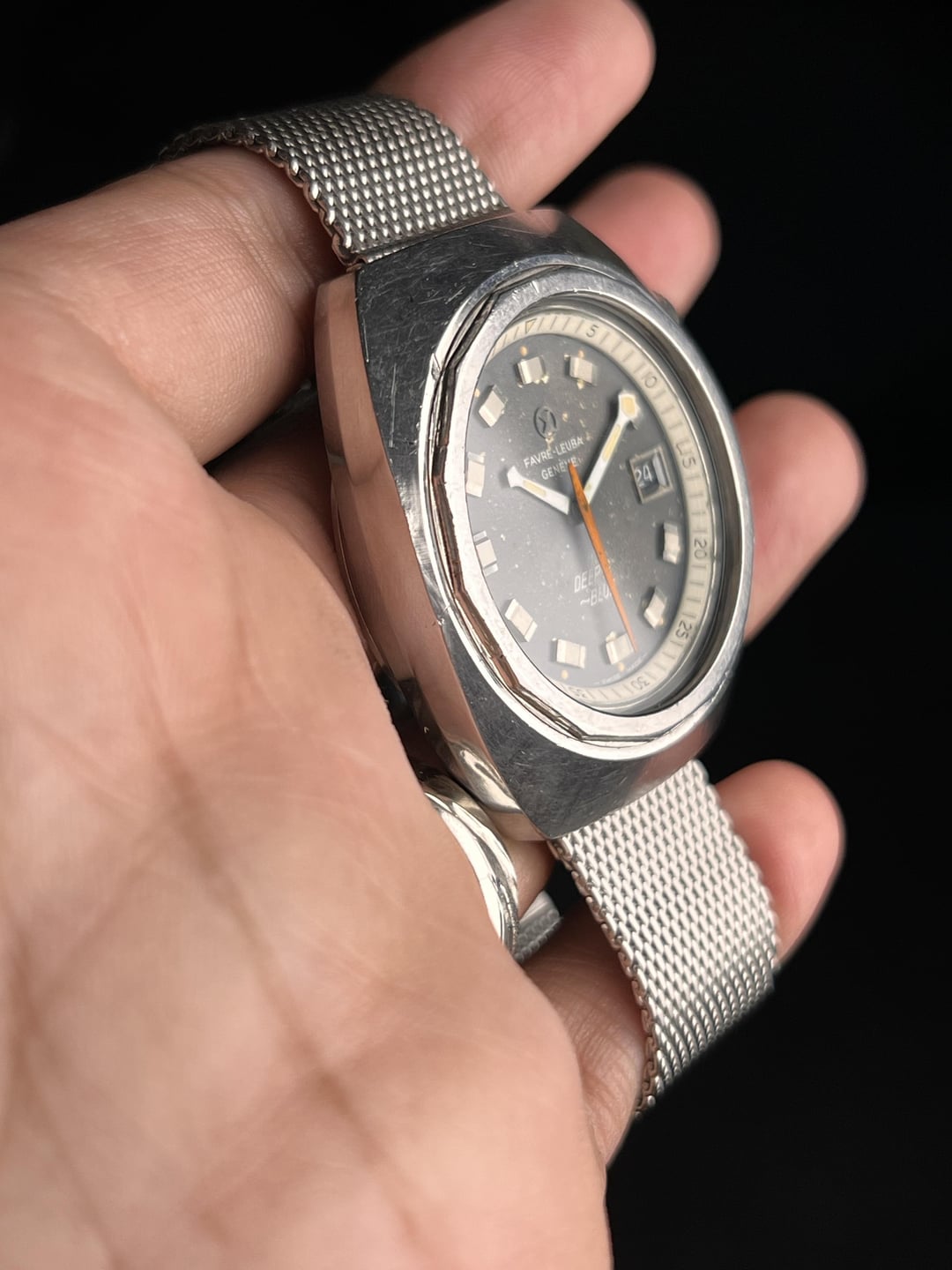 Greetings! For Sale here is a vintage Favre Leuba Deep Blue. Case diameter of 39mm, lug to lug of 45mm. Separate crown for inner rotating bezel, and a main screw down crown. Automatic movement recently serviced. Rest of the watch left untouched. Case is unpolished. Bracelet is a Japanese mesh bracelet made by Bambi. Comes as watch only. Asking USD $650 Shipped Worldwide via FedEx. Payment via Zelle preferred. PayPal FF Available. Many recent transactions. Thanks!