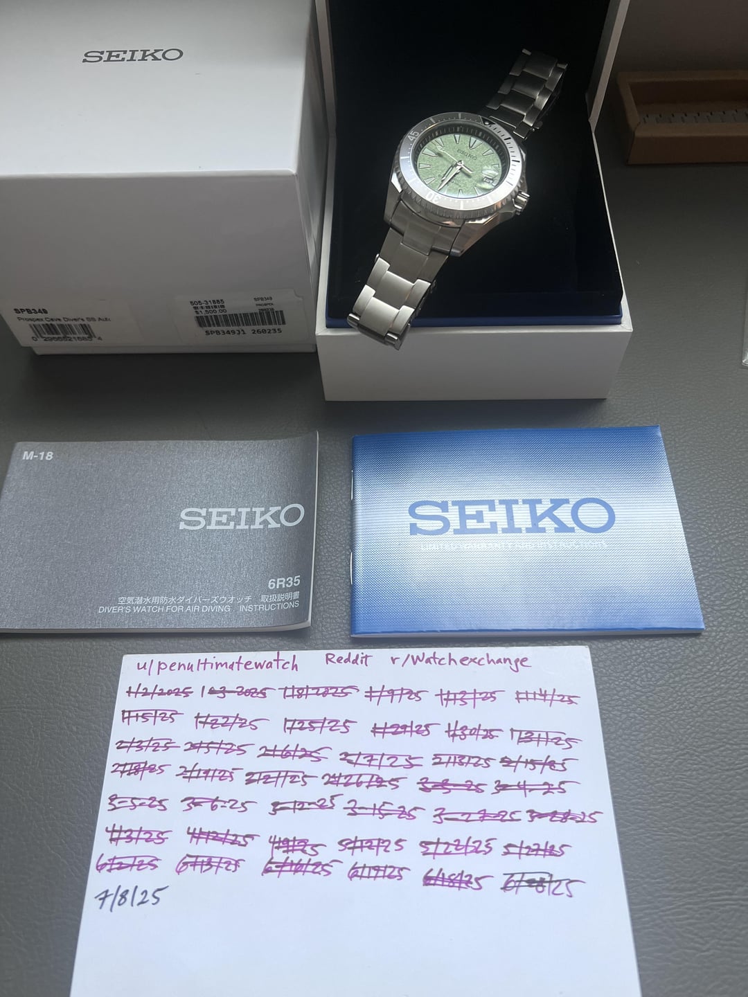 Hey Watchexchange! Up for grabs is my Seiko Prospex titanium diver reference number SPB349. This was part of a *limited release* and nicknamed Shogrun Cave Diver as the textured green dial was inspired by underwater caves. Subjective maybe, but nice nonetheless. **Condition:** Overall very good. There’s some light scratches here and there. The titanium is coated with something to make it more scratch resistant. It’s keeping good time. **Scope of delivery:** Double boxed with 12/2024 card. **Specs:** Reference number: SPB349 Case size: 43.5mm Lug-to-lug: 51mm Case thickness: 13.3mm Water resistance: 200m **Price:** $799 shipped CONUS. **Methods of payment:** Zelle is preferred; Venmo/CashApp/PayPal F&F only with significant transaction history **Trades:** Not at this time. **References:** Hundreds of successful transactions in watch trading. See my eBay account under the same name. Many references in Facebook groups, watch forums, and on WUS. **Timestamp:** https://imgur.com/a/HQWbaU6 **Photo album:** https://imgur.com/a/mpNbnVf