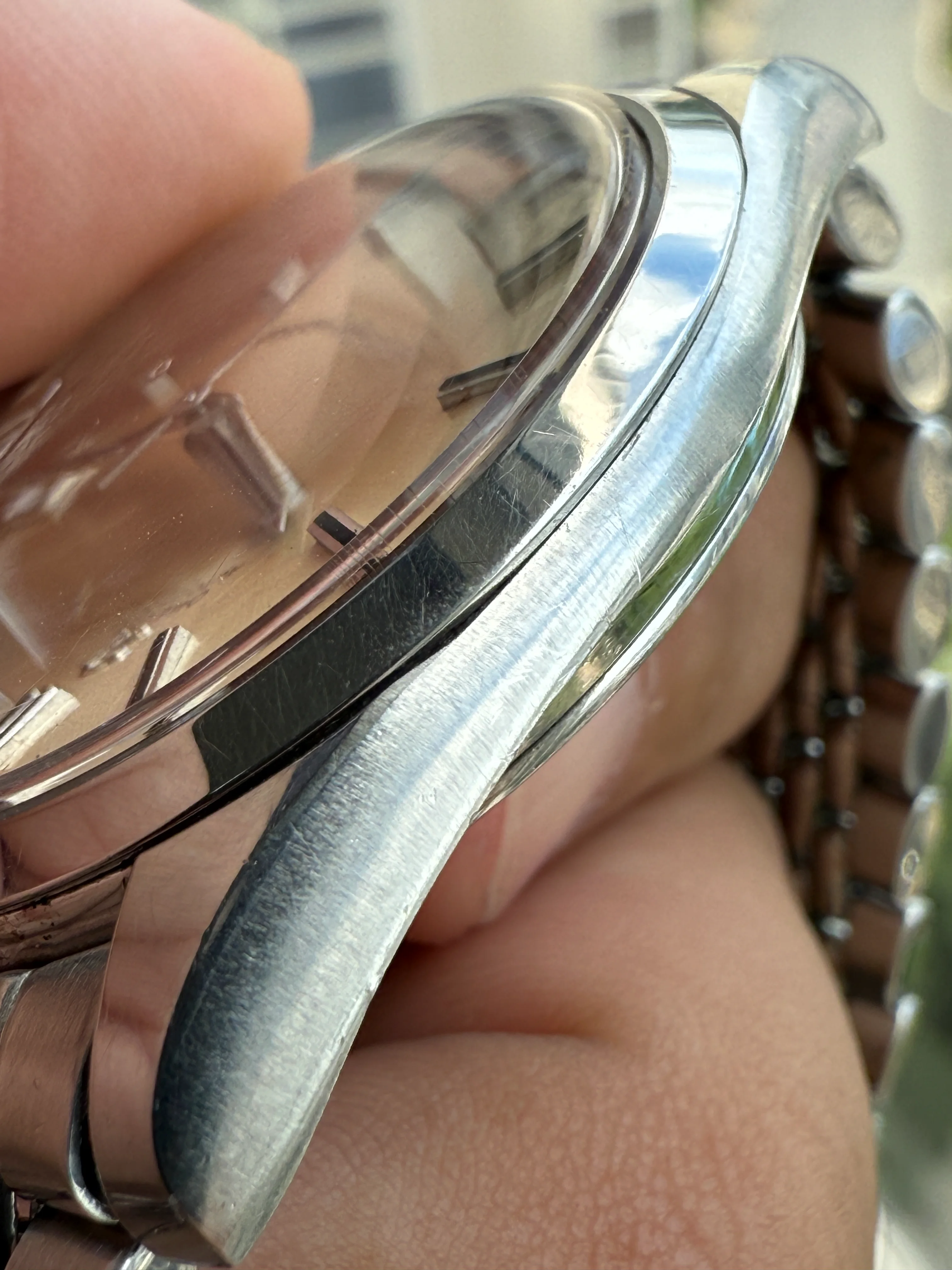 - Dial: Original white sunburst dial with black painted hour markers in good condition; date-aperture frame at 3; dauphine hands with signs of age; prints and hour markers are all good. There is a small stain at the OMEGA script.