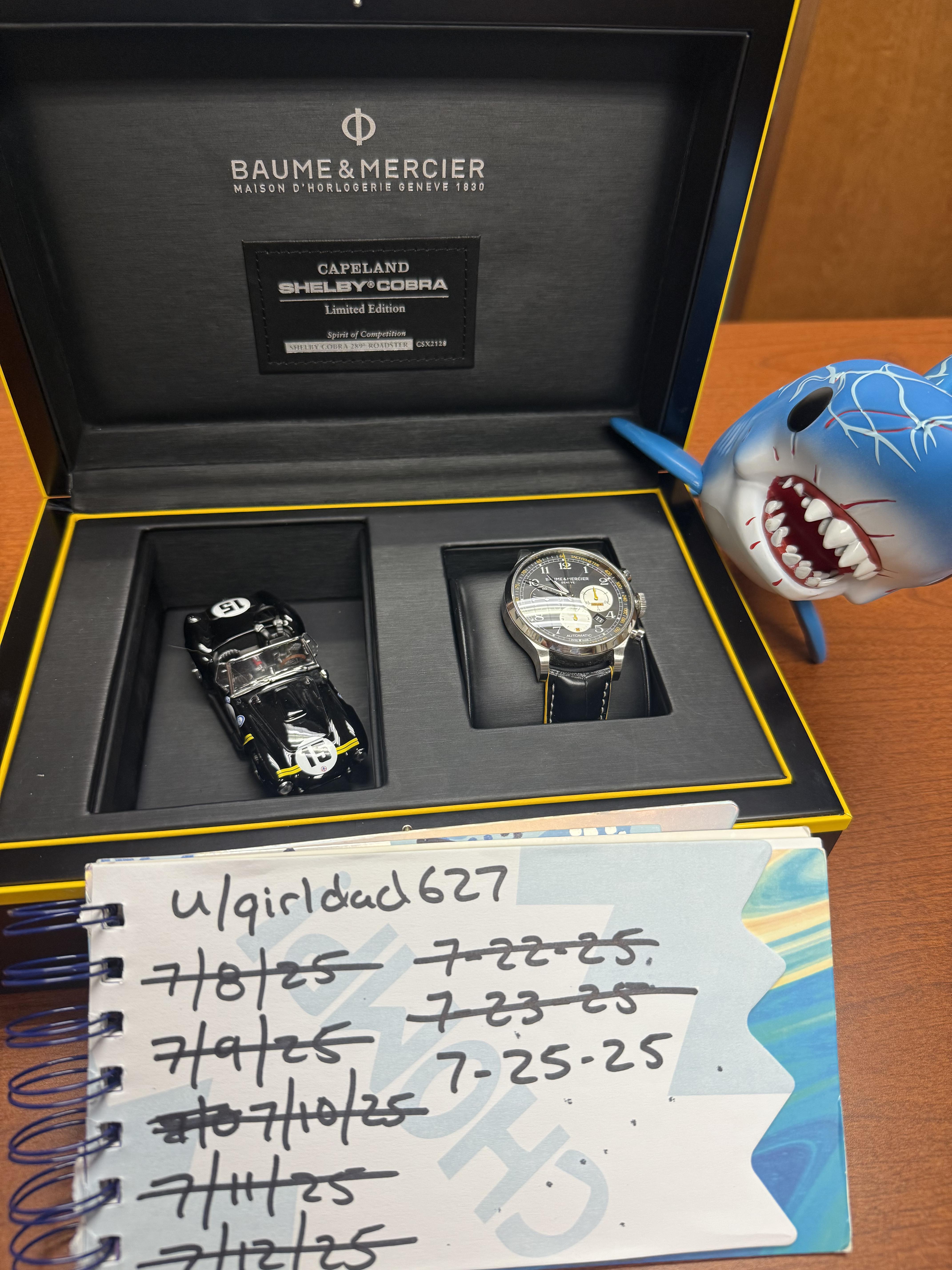 I am the original owner of this watch. It was purchased back in 2016 from Tourneau. Watch has light marks & scuff throughout including the clasp. The strap on the watch is brand new from Baume & Mercier. Watch will ship with box, outer box & Shelby car model. Watch will ship with history booklet. Timestamp & More Photos: [https://imgur.com/a/hbe6QmV](https://imgur.com/a/hbe6QmV) **- Limited Edition, One Out of 1963 Ever Made** **- Rhodium-Plated Hands** **- 48 Hour Power Reserve** **- ETA Valjoux Caliber 7753** **- Vibrations Per Hour: 28,800** **- Jewels: 25** **- Black Leather Strap with Pattern, White Stitching & Yellow Inner Lining** **- Scratch Resistant Sapphire Crystal** **-** [**50 Meters / 165 Feet Water-Resistant**](https://www.authenticwatches.com/baume-et-mercier-capeland-10282.html) **- Case Thickness: 14.9mm** **- Inlet Size: 19mm** **- Sapphire Crystal Exhibition Case Back with CSX2128's Famous 15 Race Number** **- Luminescent Hands & Hour Markers** **- Push & Pull Crown** Asking price is $1999 overnight insured shipping with signature included. Conus shipping only Paypal F&F or Zelle only. I have over 200 confirmed transactions over at [u/knife\_swap](https://www.reddit.com/user/knife_swap/) buy with confidence. I am more than happy to facetime prior to purchase to show you the watch. Please comment on this post before sending a message. Thank You for looking