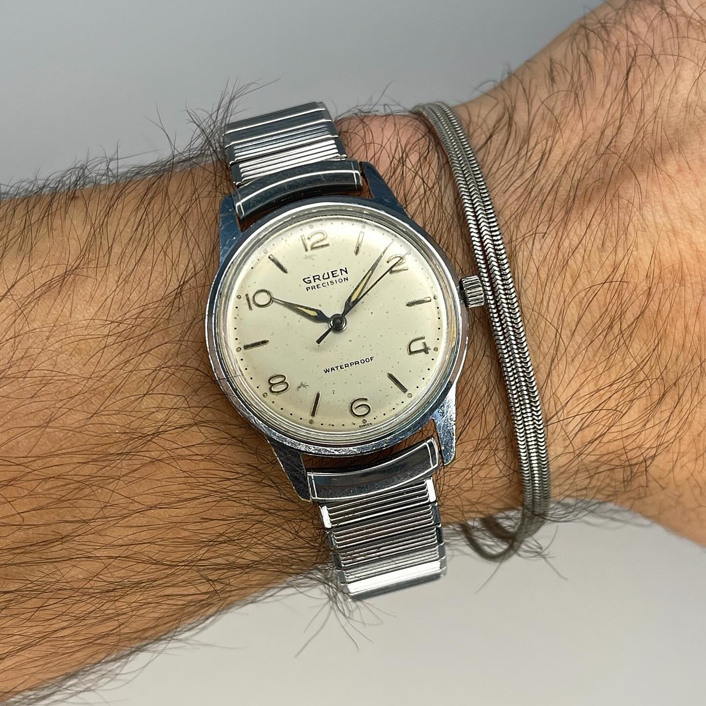 [WTS]🔥 Vintage Gruen Precision Sport Men’s Manual Watch 34mm 50s, $50 SHIPPED !!! 🔥 Brand: Gruen Name: Precision Movement: Manual Complications: Hours, Minutes, Seconds Case Material: brass Glass: plexiglass Caseback: closed Diameter: 34mm Thickness: 10mm Lug Width: 17mm Water resistant: 30m Dial: Cream Hands: Silver Band: stretch bracelet Set: watch only Condition: Good. Good timekeeping. There are minor abrasions on the watch case. Please review the images provided. SHIPPING: Free WORLDWIDE standard shipping from Ukraine Shipping to the USA: 10-18 days to the buyer’s door by UPS/EMS/USPS. Shipping to Europe: 7-12 days. For other countries, please specify in private messages. Payment: The price is indicated in Crypto USDT , alternative PayPal FF(+2%) Price: 50 USDT TIMESTAMP AND ALBUM WITH MORE PHOTOS: https://photos.google.com/share/AF1QipPOyrRGoju_CzfHUX3H7-VJ0HKpQAAgZo5bZ3KVmRy33NceKq0ieqLOqwImtpmy2A?key=a3lpOUNpaW1yandnR0gtUWluN3B3WHZ6dXNLM29R