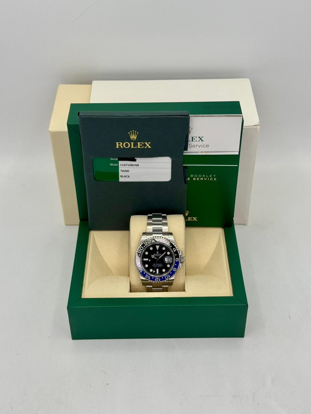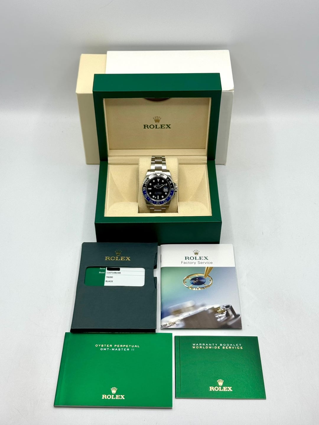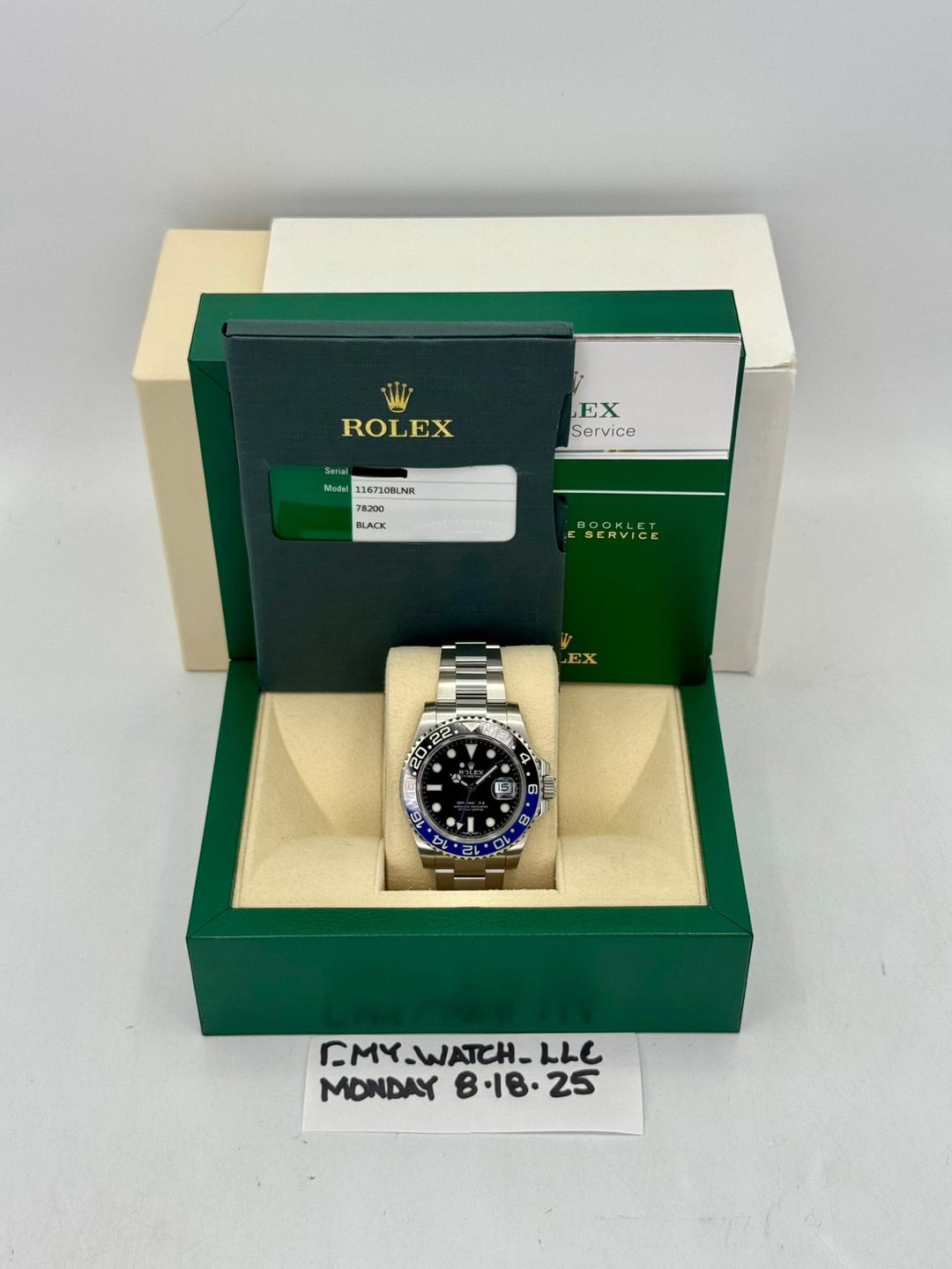 # 🔵2016 Rolex GMT-Master II "Batman" 40mm 116710BLNR Stainless Steel Oyster Bracelet Black Dial **🔵TRADE or SELL us your luxury watch, all brands considered. Message me details.** **Includes the following:** **✔️Original Rolex Double Boxed** **✔️Box and Papers - Yes** **✔️Warranty card dated 2016** **✔️Manual and Warranty booklets** **✔️Green and White Hang Tags included** **✔️Material: Oystersteel** **✔️Bezel: Bi Color Ceramic Bezel in Black and Blue** **✔️Size: 8.0inch wrist (Full Links)** **✔️Watch is in excellent overall condition. Please see photos for details.** **✔️Trades welcome** Business Name: **My Watch LLC** LOCATION: Oak Park, Michigan ✔️[MyWatchLLC.com](http://mywatchllc.com) for current inventory ✔️Google Business Listing [https://g.co/kgs/Cmd6FPW](https://g.co/kgs/Cmd6FPW) ✔️Business Hours M-F 9-6 ✔️Facetime/Video chat/calls welcome to view the watch interested. ✔️Contact: 248-422-0909 via text or call for quickest response. 🟢TERMS: Visit [MyWatchLLC.Com](http://mywatchllc.com) for payments accepted 🟢REFERENCES/REVIEWS: We are well reviewed on all platforms from google, trust pilot, rolexforums, additionally we have 300+ reference in multiple FaceBook watch groups, reference checks welcome. 🟢SHIPPING: If you are not local, we offer Fully Insured FedEx overnight shipping in the USA for a fee. International shipping available.