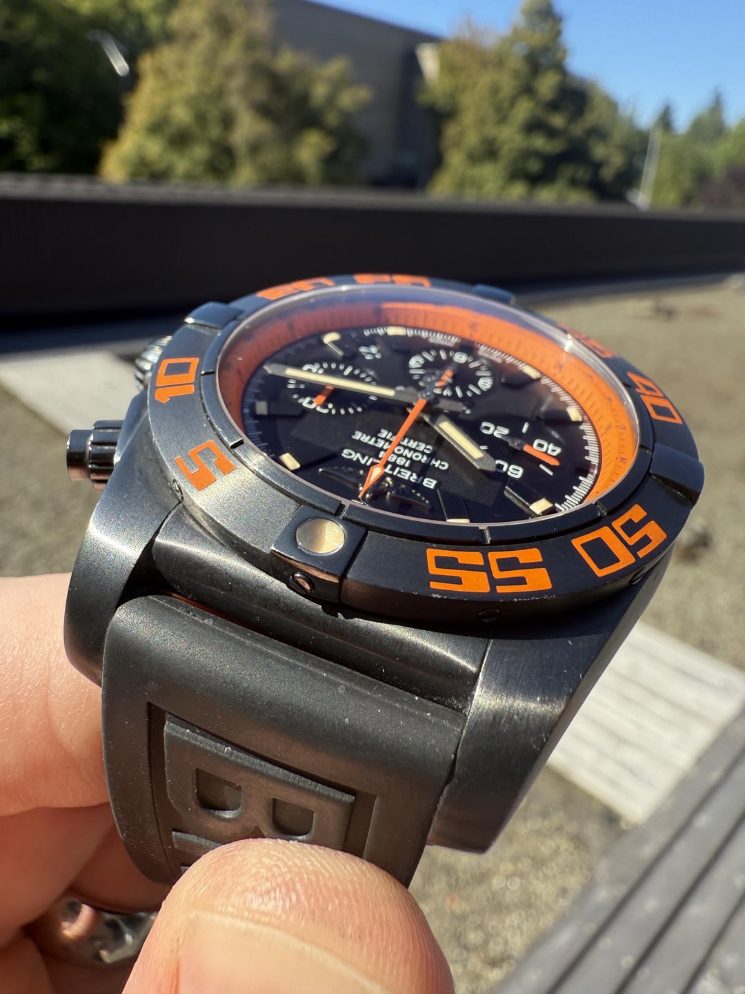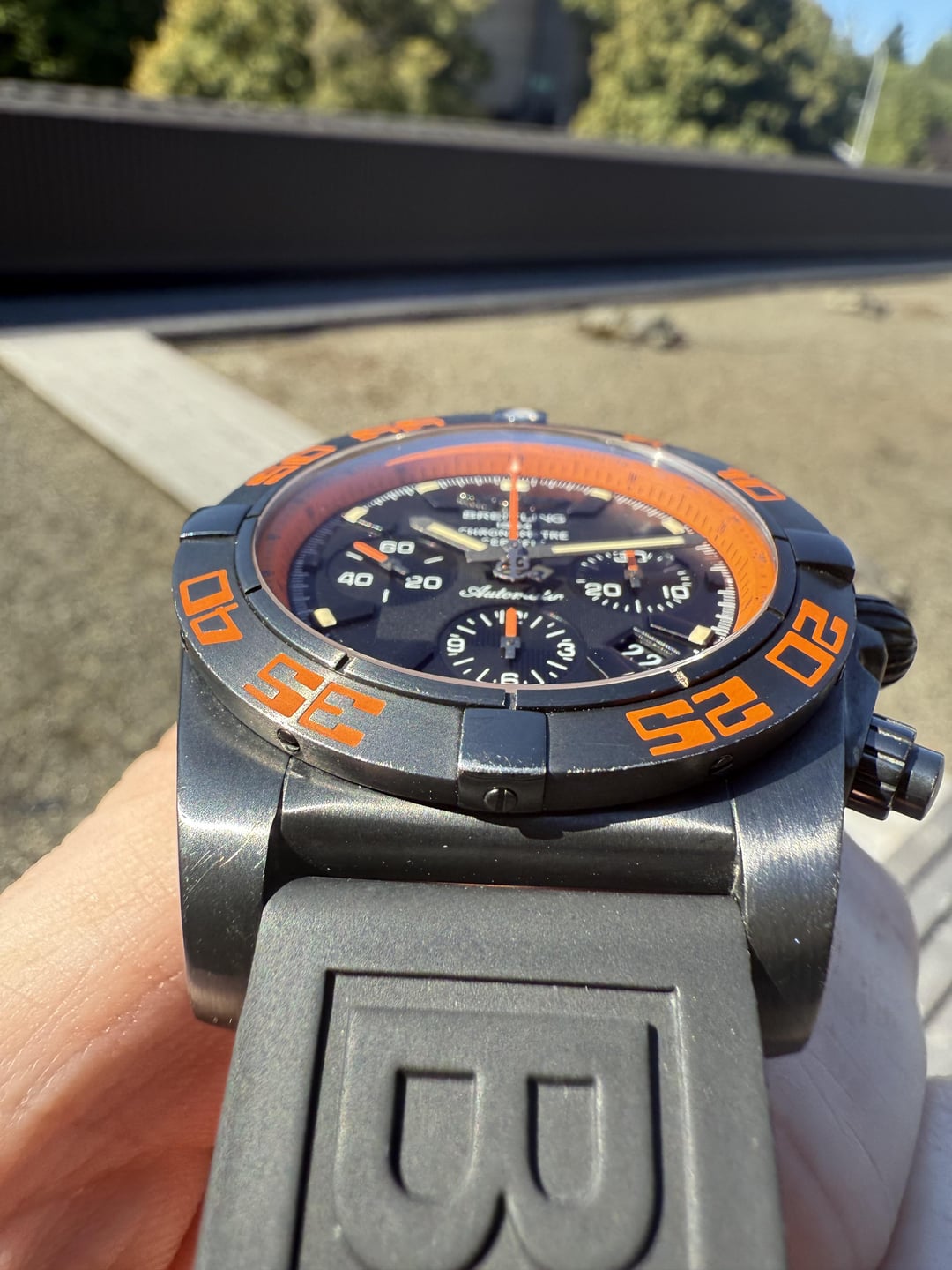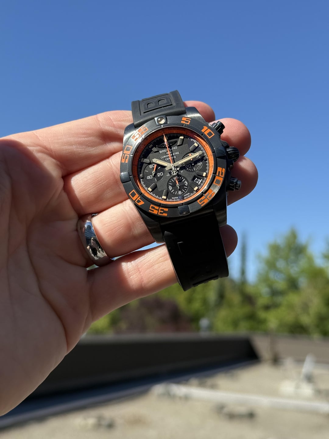 Model: Chronomat 44 Raven Ref. MB0111C2/BD07 Case Material: Black Stainless Steel Case Dimensions: 44mm Bezel: Blacksteel Unidirectionally Rotating Timing Bezel Dial: Black Dial with Orange Accents Band Material: Breitling Black Rubber Strap with Blacksteel Deployant Max Wrist Size: 7.75 in. Movement: Automatic, Mechanical Chronograph Condition: Watch is in nice preowned condition with light scratches on the case, bezel and bracelet. Blackened coating is showing minor wear in some areas Accessories: Full Set Price: $3,445 shipped! Bank wire price. Can take cards for an added cost. WA residents subject to sales tax. Email: [email protected]