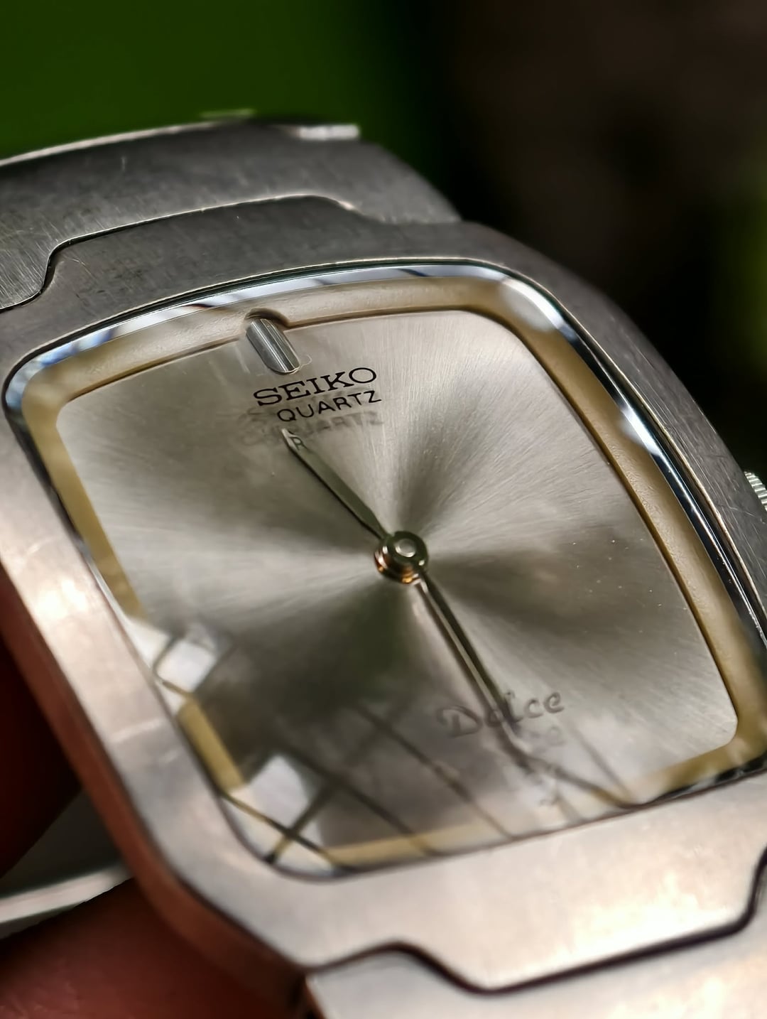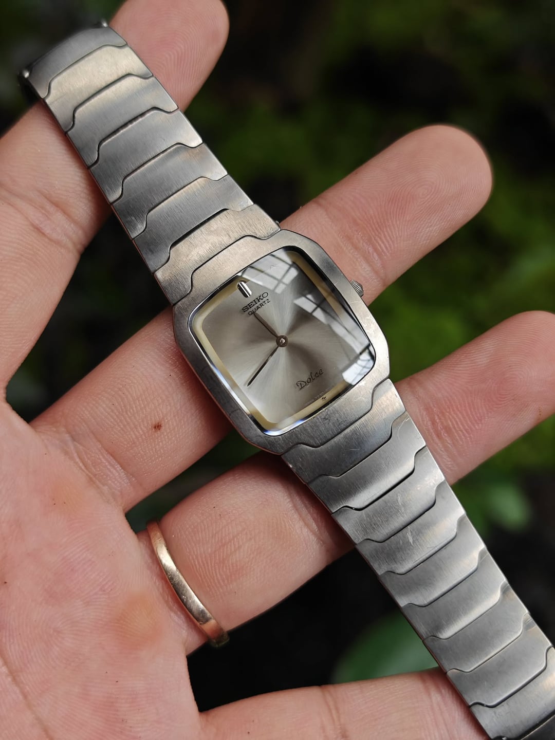 Up for sale is a Seiko Dolce ref. 7730-5010, part of Seiko’s premium quartz dress line from the 1980s. This example features a full titanium case and integrated bracelet, making it incredibly light and comfortable on the wrist. Details: Reference: 7730-5010 Movement: Seiko Quartz 7730, slim and reliable Case/Bracelet: Brushed titanium, integrated design, lightweight comfort Dial: Silver sunburst with minimalist Bauhaus-style layout, cutout at 12, original signed crown Size: Bracelet currently fits up to \~6.7 inches (17 cm wrist) Condition: Clean vintage condition with honest wear, sharp case, original bracelet Price: $199 shipped worldwide No trades. A great chance to pick up a vintage titanium Seiko Dolce with its distinct 1980s design language and minimalist dial at an affordable price.