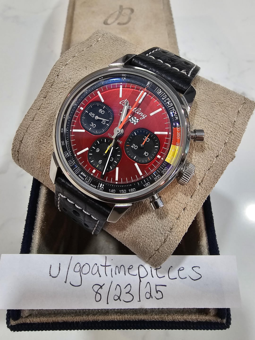 🔥2025 BREITLING TOP TIME🔥 Reference: AB01761A1K1X1 Dial: Beautiful Red Dial 🚘CORVETTE EDITION🚘 Case Size: 41Ⓜ️Ⓜ️ Material: Stainless Steel/Leather $4999 SHIPPED IN THE US Includes: Complete Set Condition: Excellent pre-owned Light desk rash on clasp ------------------‐----------------------‐-----------------‐------------------ ***Please message me if you would like to see more pictures or if you would like me to show you live on a video call*** I have over 40 confirmed Reddit transactions. Buy with confidence!! https://www.instagram.com/goatimepieces?igsh=bTFkaWlscnR5aGJj